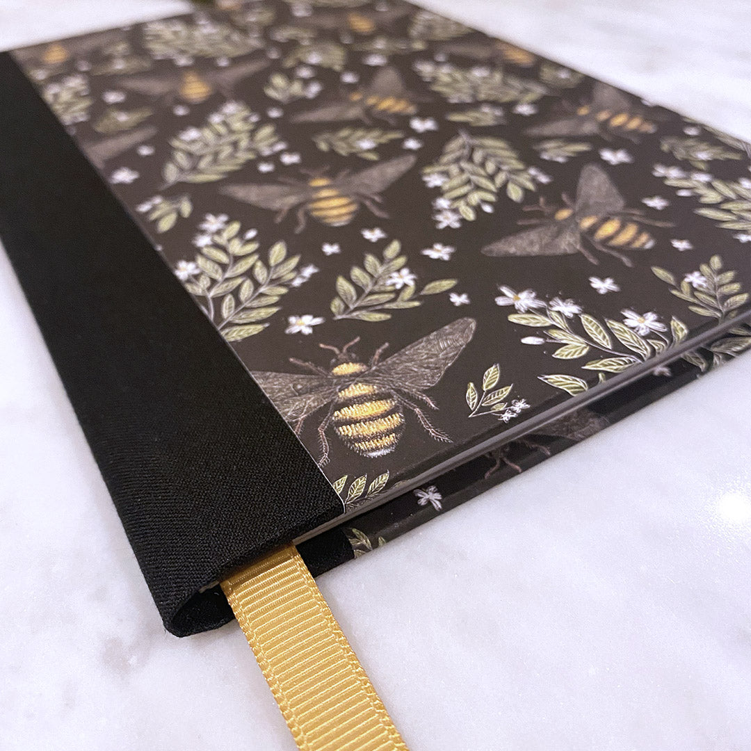 Hardback A5 notebook covered using a beautiful Bumble Bee design, with subtle metallic detailing. Also includes a black cloth spine and a luxe gold Grosgrain ribbon page marker, to pick out the gold colours used in the pattern.