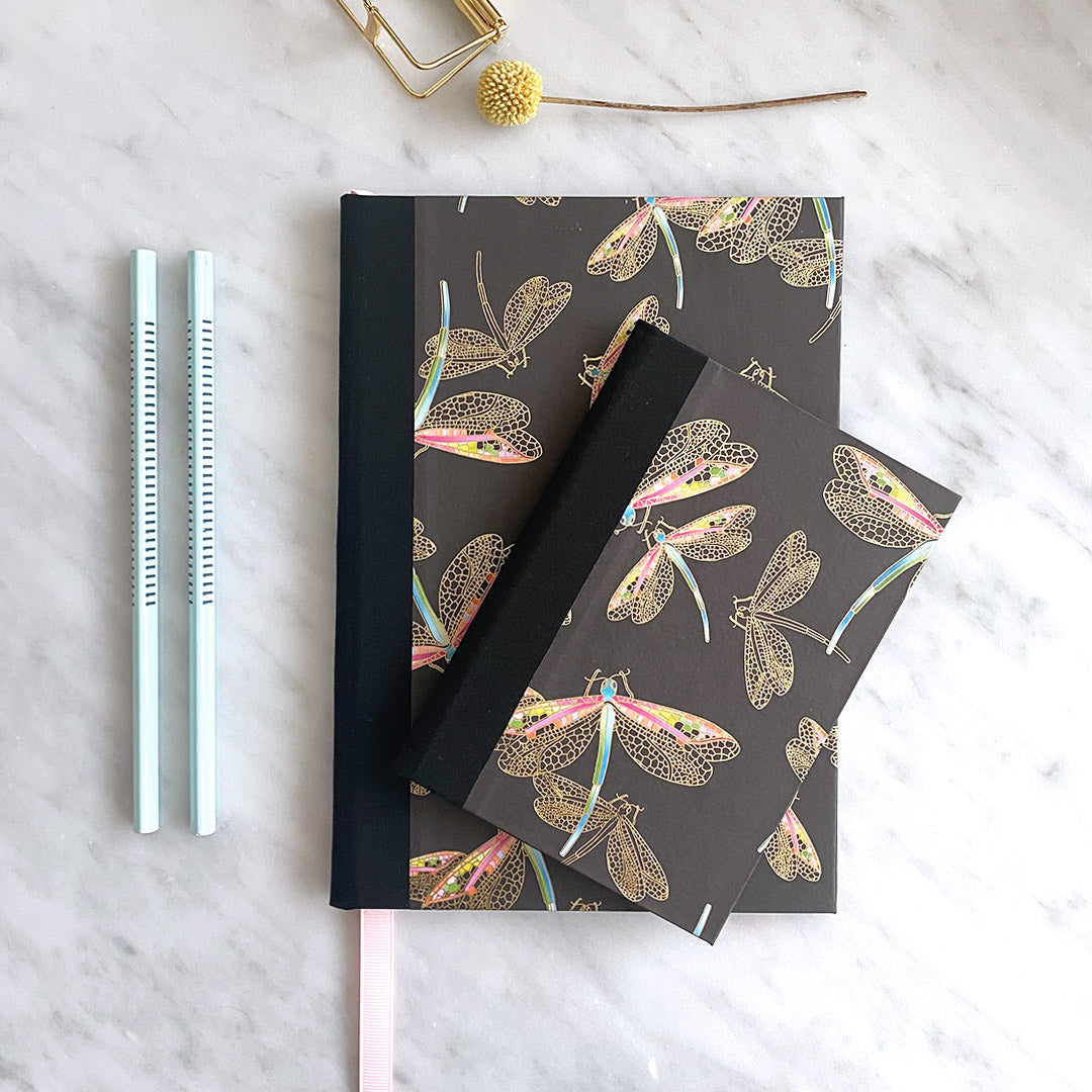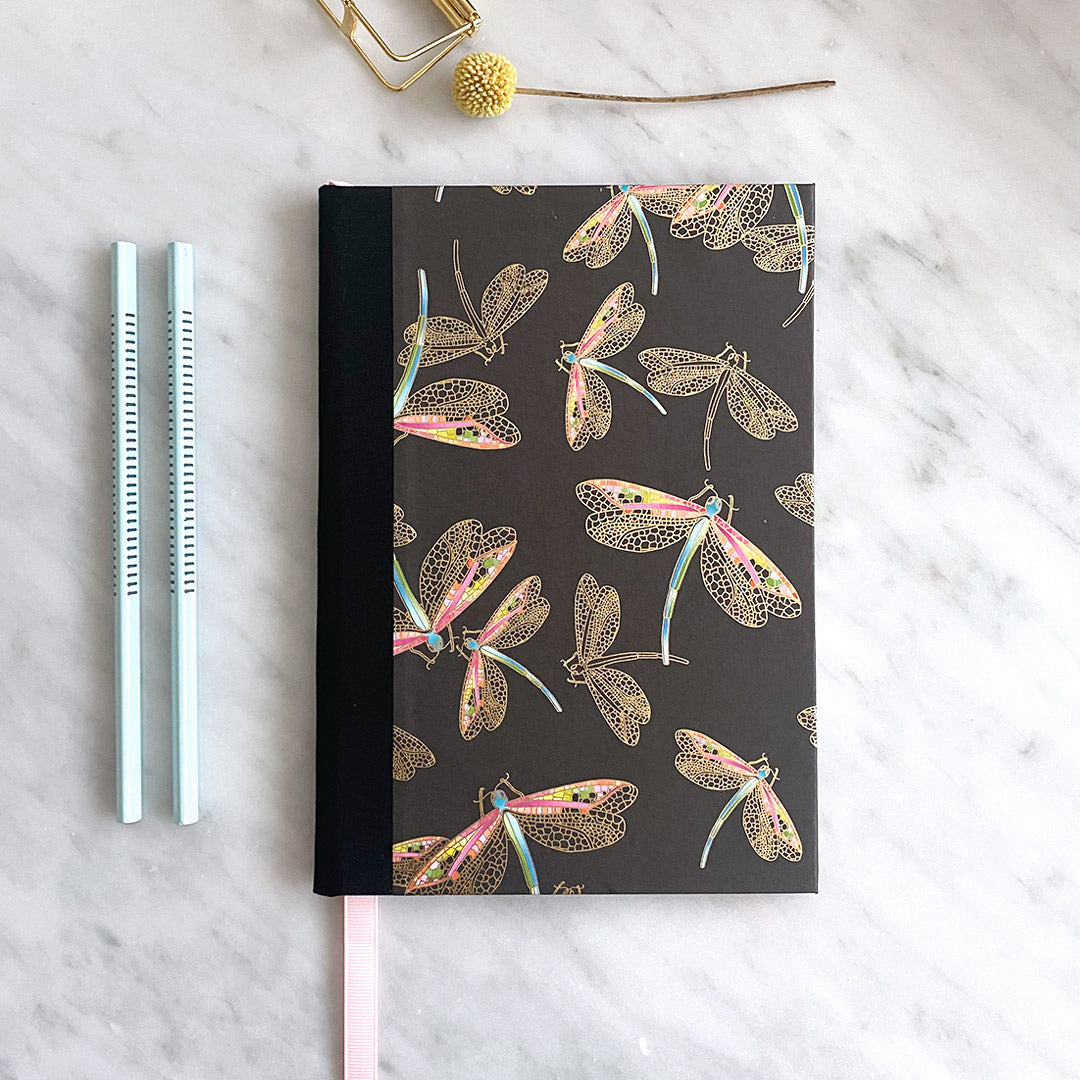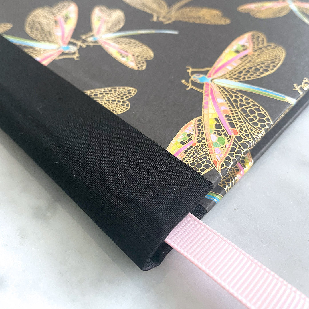 Hardback A5 notebook covered using an elegant Dragonfly design with subtle gold metallic detailing. Includes a black cloth spine and a luxe pink Grosgrain ribbon page marker, to pick out the pink accents in the pattern.