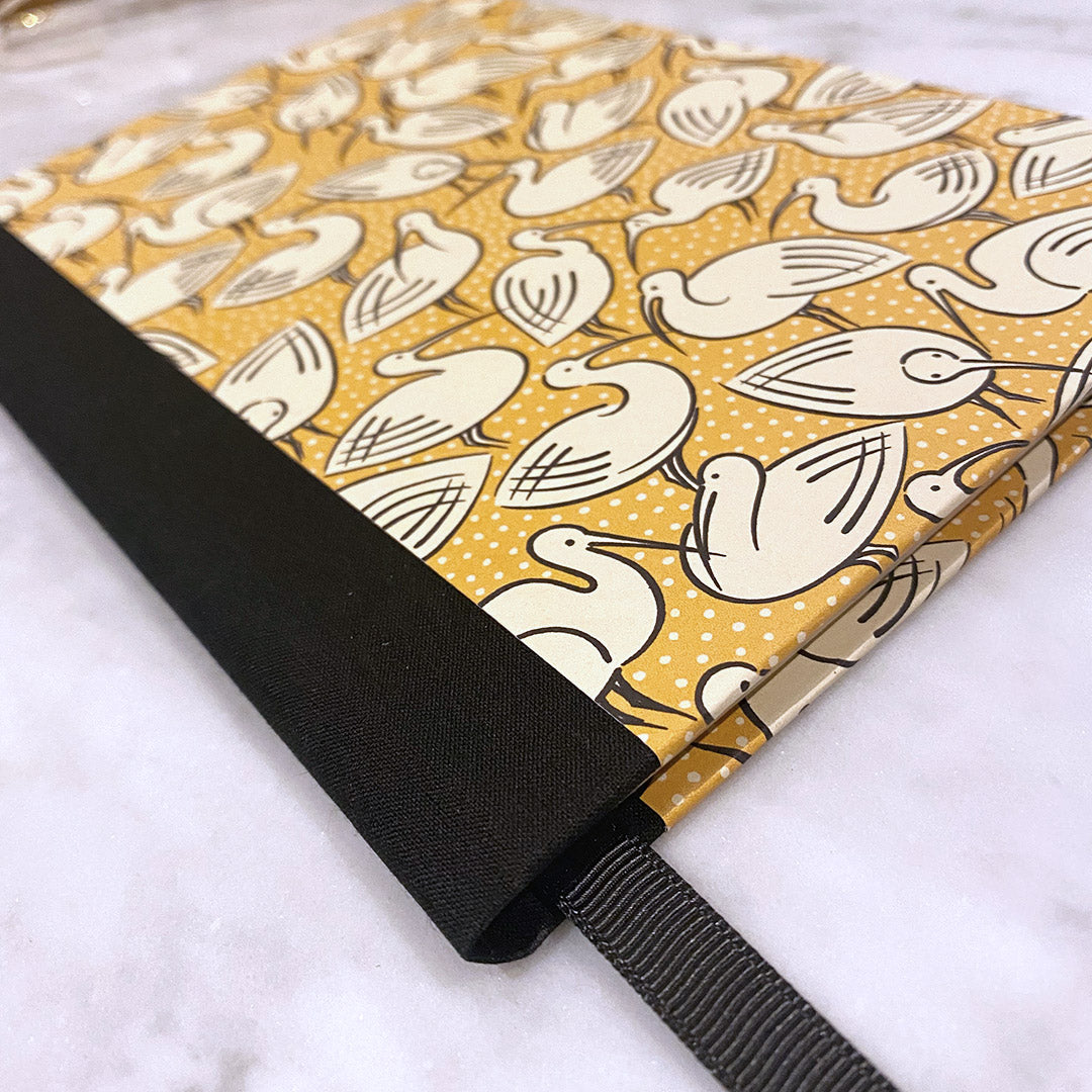 Hardback A5 notebook covered using a unique pattern featuring an Ibis bird design. Also includes a black cloth spine and a luxe black Grosgrain ribbon page marker, to pick out the black colours used in the pattern.