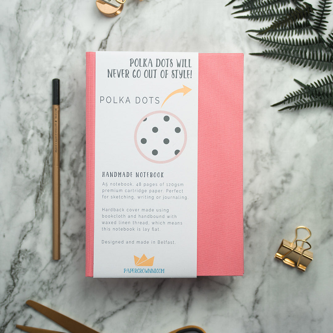 Hardback A5 notebook covered in a hot pink bookcloth, with uplifting polka dot endpapers. Classics NEVER go out of style!
