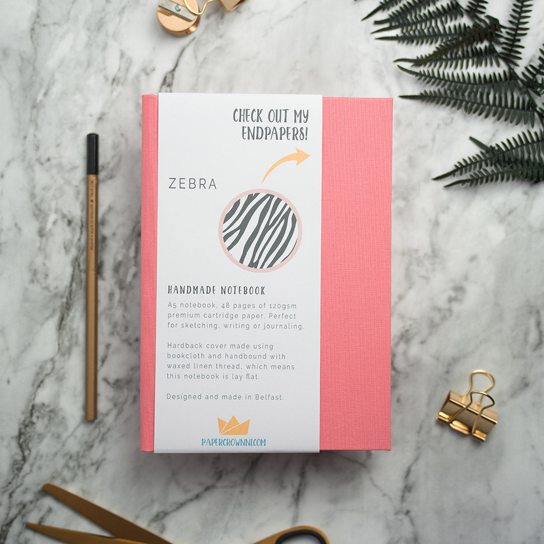 Hardback A5 notebook covered in a striking hot pink bookcloth, with stunning Zebra print endpapers.