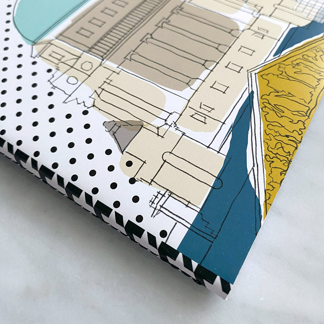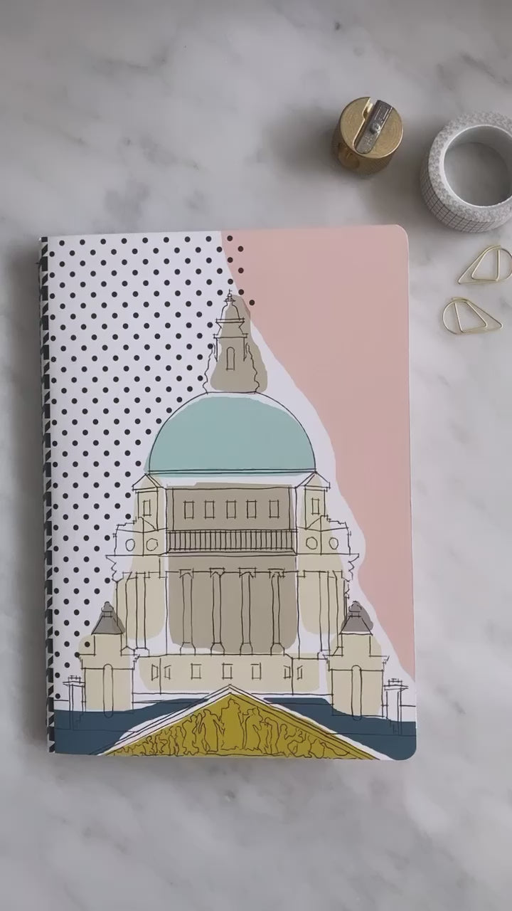Softcover A5 notebook with an original illustration of Belfast City Hall. The notebook has a machine sewn spine, rounded corners and a luxe cover which includes a bright pop of colour on the inside.