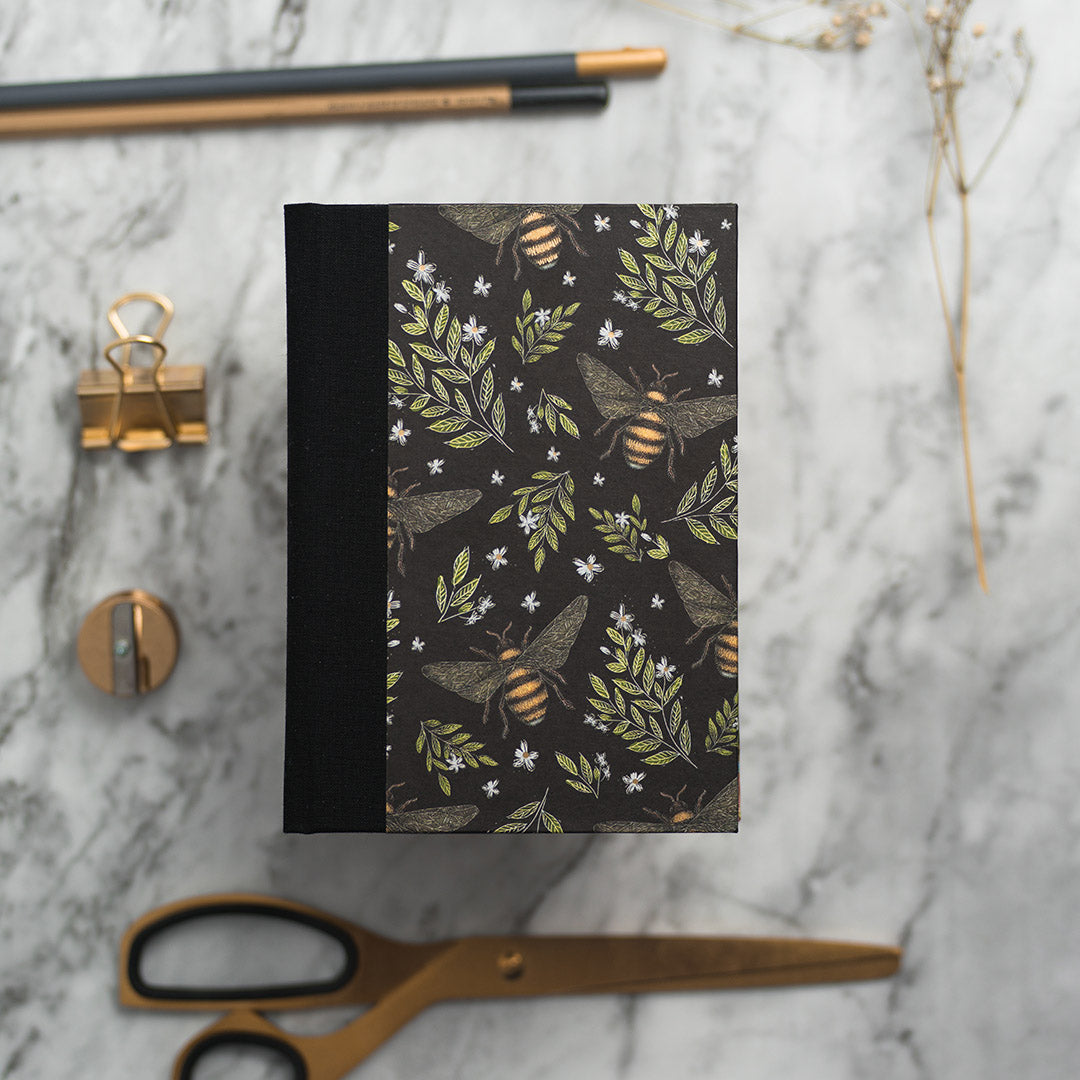 Hardback A6 pocket notebook covered in a very cute Bumble Bee design with contrasting black cloth spine. Also includes subtle metallic detailing.