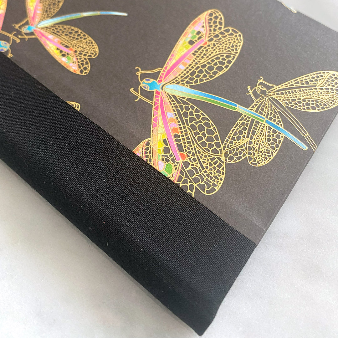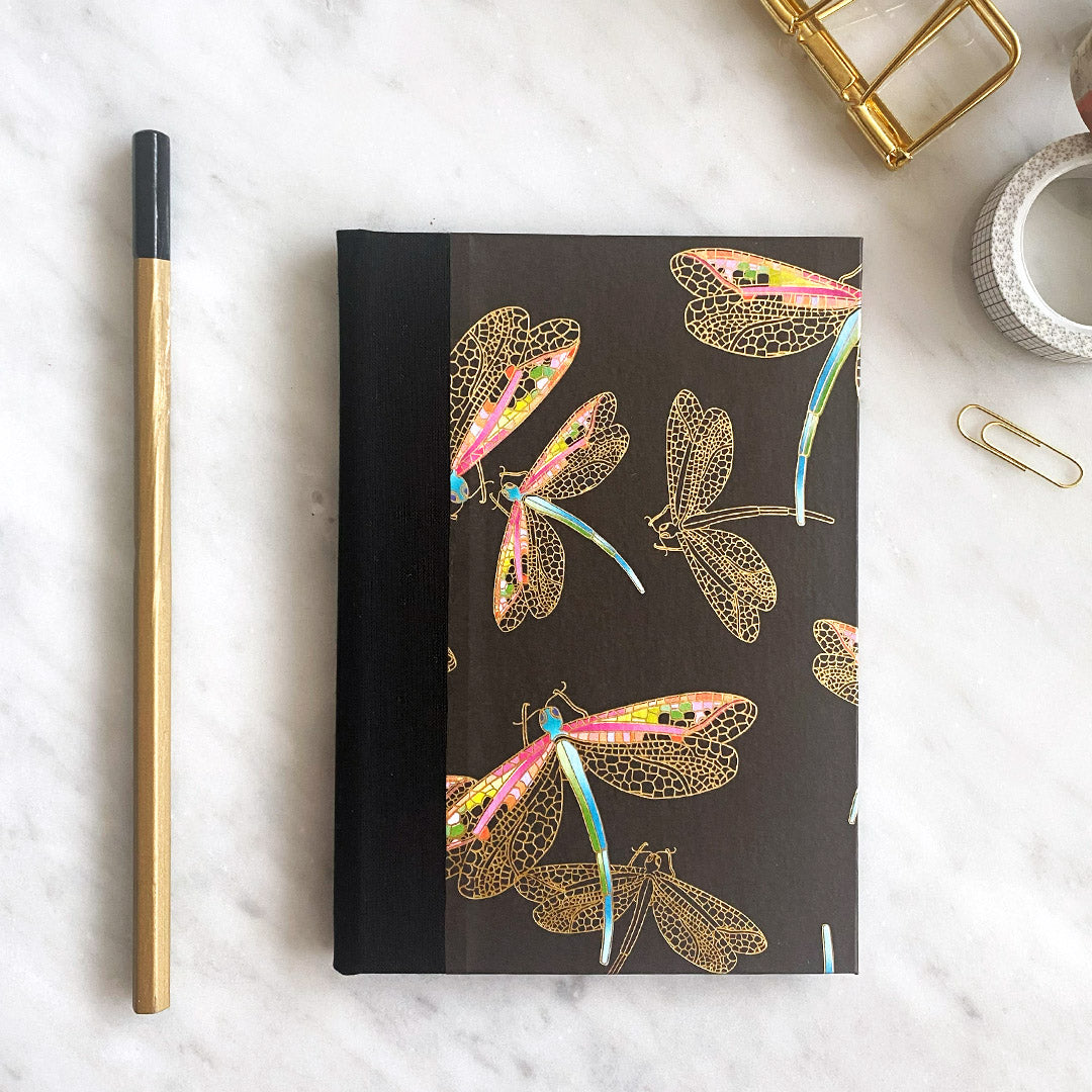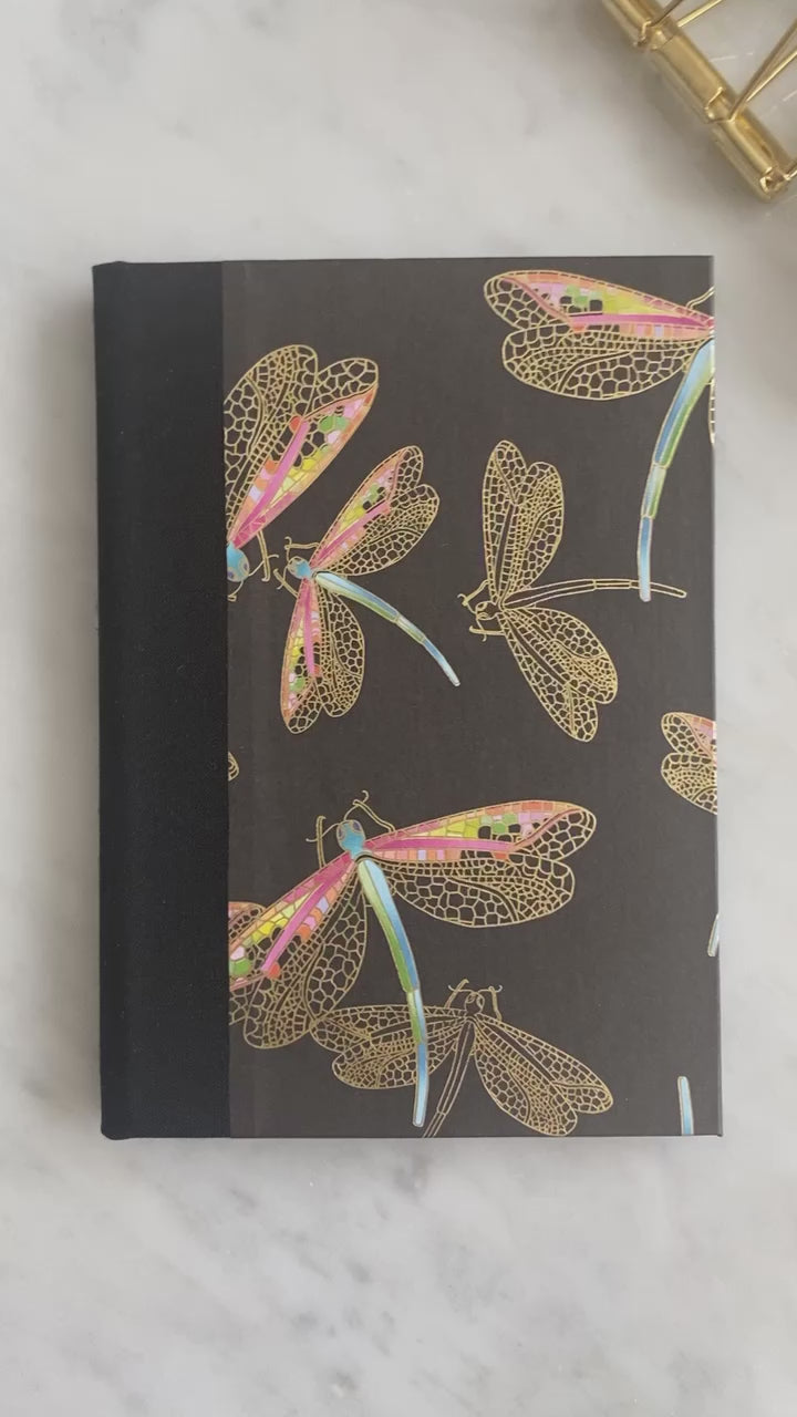 Hardback A6 pocket notebook covered in a delicate Dragonfly design with contrasting black cloth spine. Also includes subtle metallic detailing.