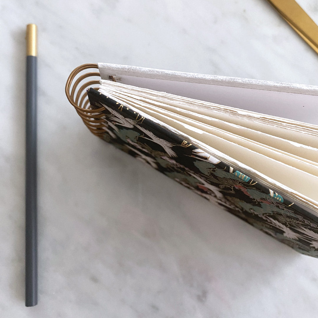 Hardback A6 sketchbook covered using a stunning Crane design, with elegant Mulberry paper on the back in a neutral shade. The decorative paper on the front is handmade Japanese paper which has been screenprinted with the Crane pattern. Stunning!