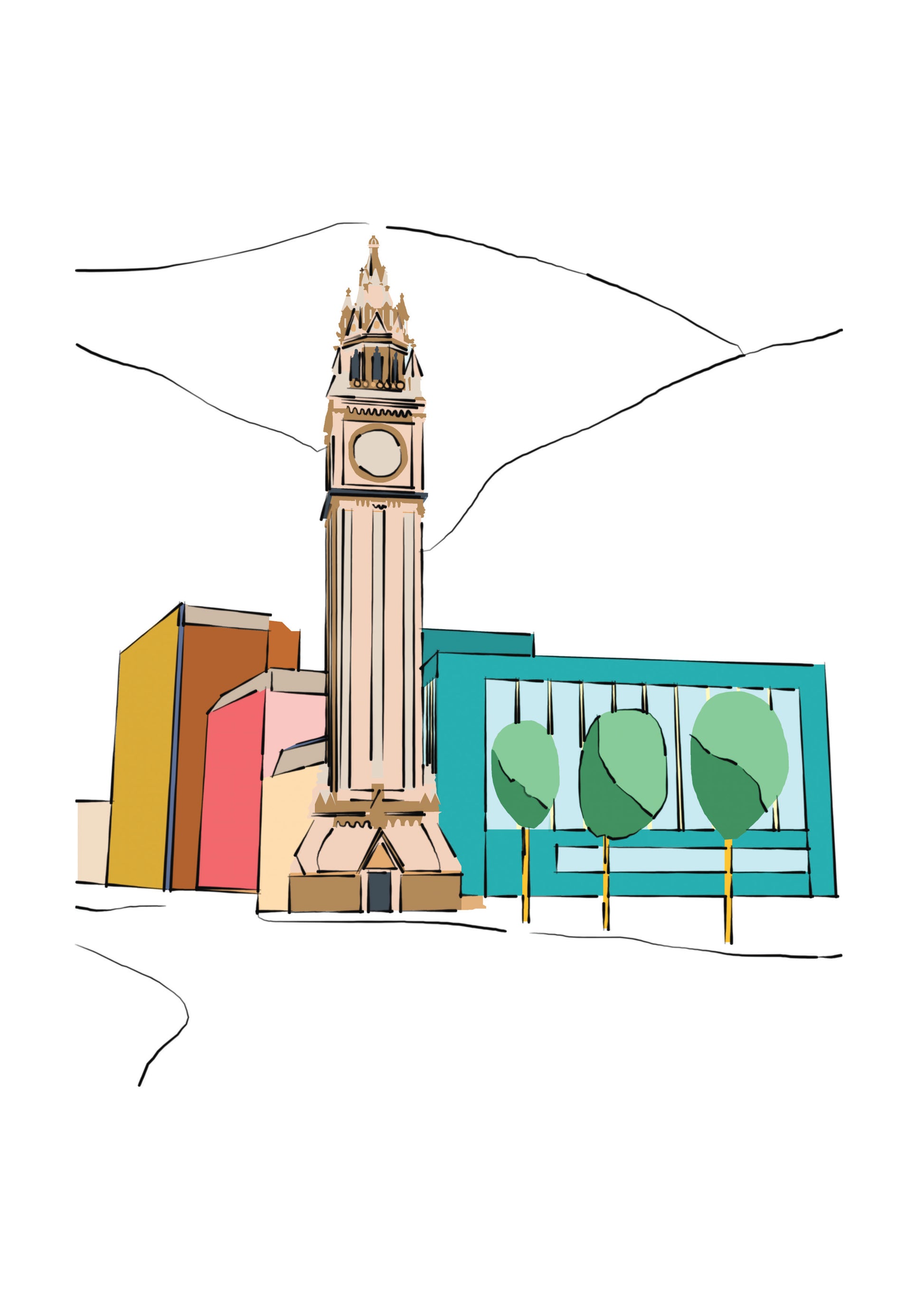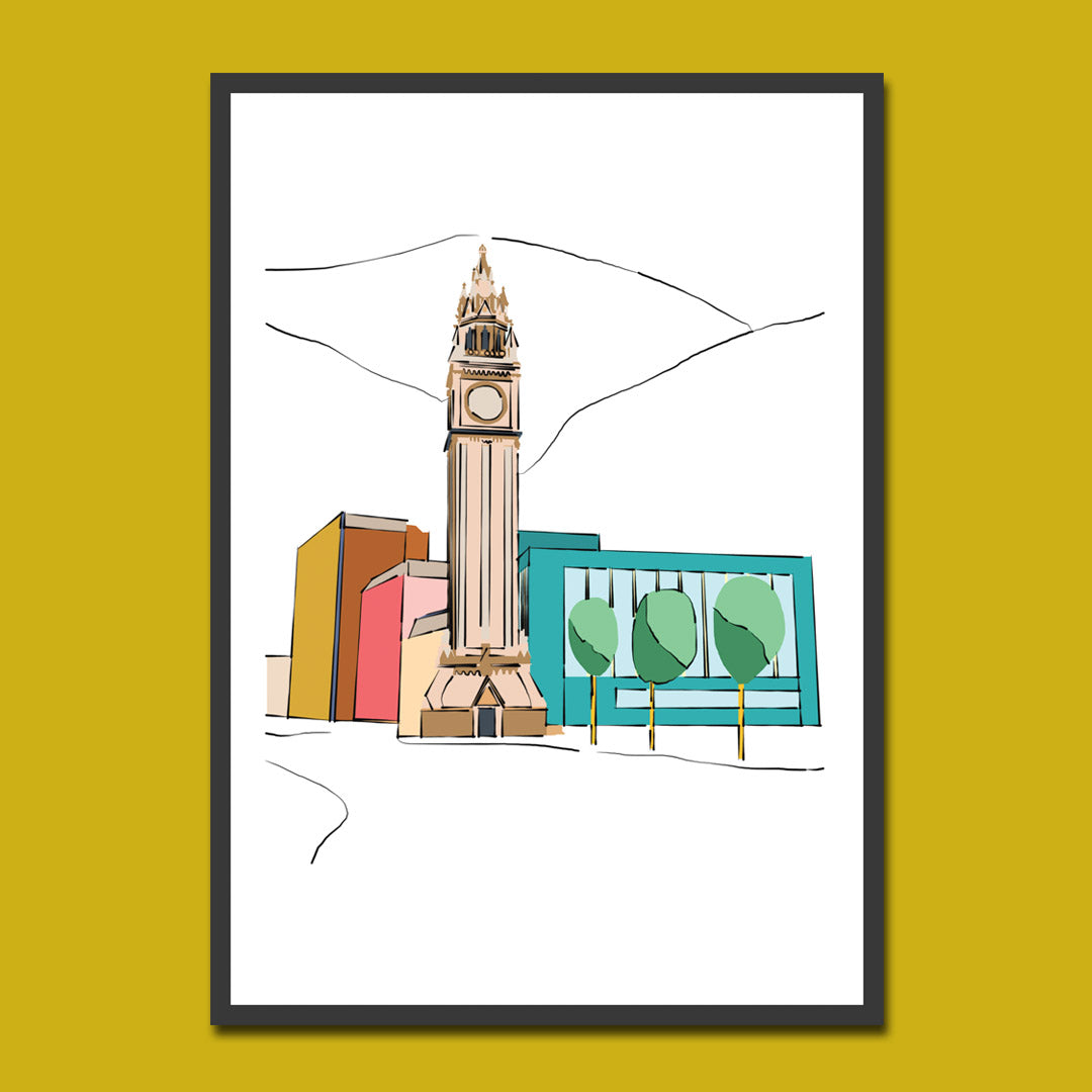 High quality print of an original illustration by PAPERCROWN NI, showcasing the Albert Clock, a dominant presence in Belfast city centre and a focal point for thousands of tourists every year!