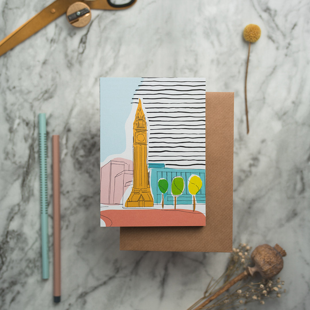 Original illustration of the Albert Clock, which is a dominant presence in the Cathedral Quarter, Belfast city centre. A6 card designed in Belfast. Printed in the UK on 100% recycled card and includes a Kraft envelope, with plastic free packaging.