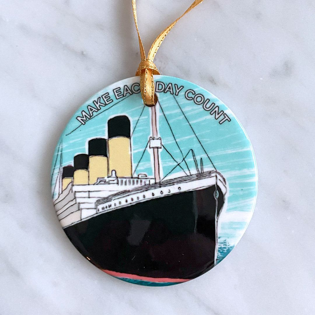 Ceramic Christmas tree decoration of the most famous ship in the world: Titanic. Includes a well known line from the Titanic movie, but do you know who said it and in which scene?!