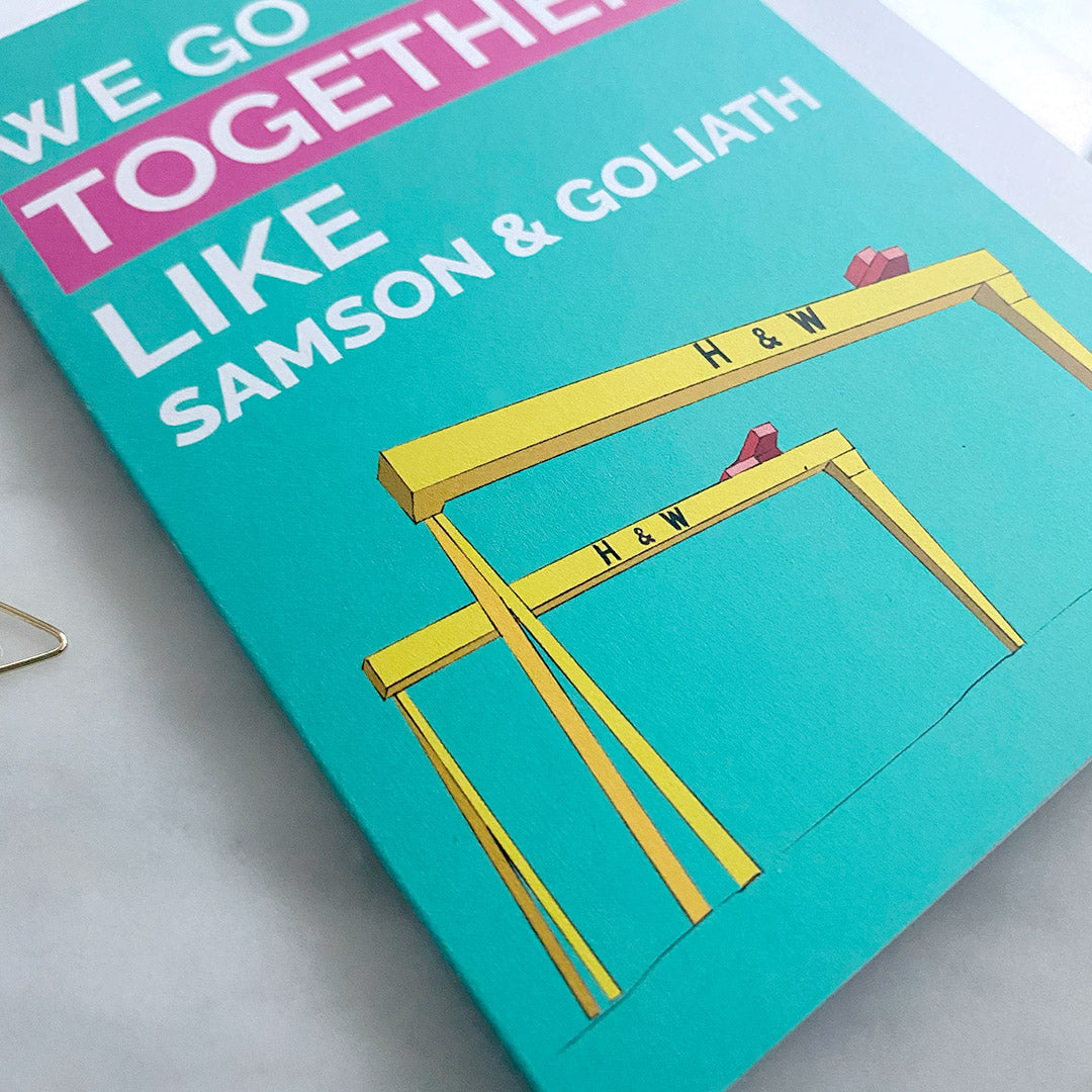 Celebrate Valentine's the Northern Irish way by gifting this unique card! The Samson & Goliath cranes dominate the Belfast city skyline and are symbolic of Belfast's shipbuilding history (they are owned by Harland & Wolff, the company that designed and built Titanic).