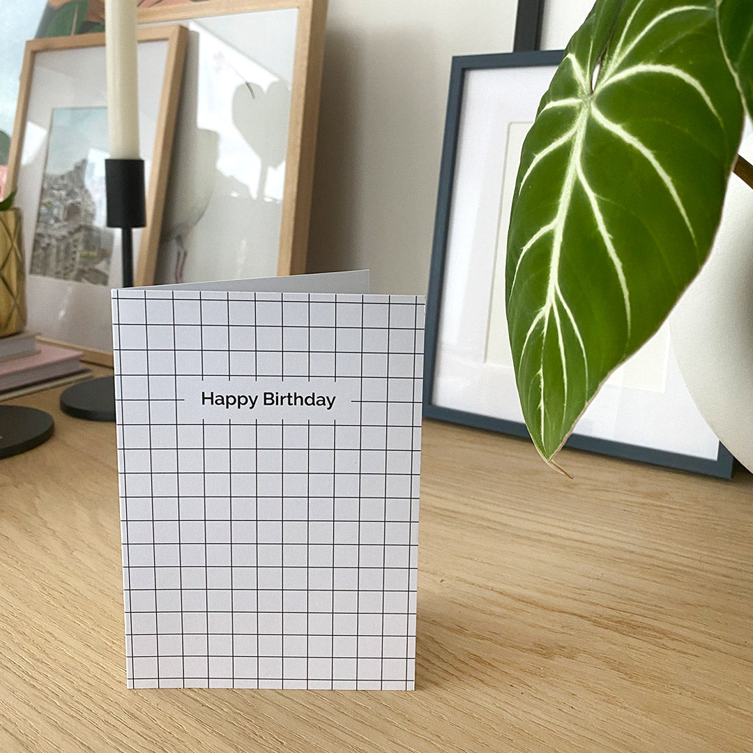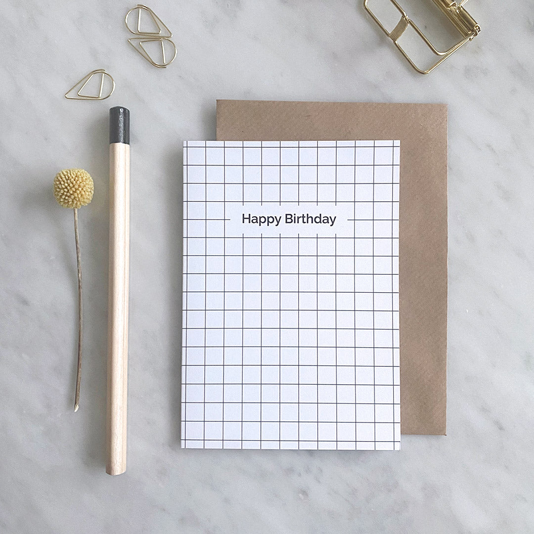 Birthday card with a very modern, Scandinavian aesthetic using a monochromatic grid design. A6 card designed in Belfast. Printed in the UK on 100% recycled card and includes a Kraft envelope, with plastic free packaging.