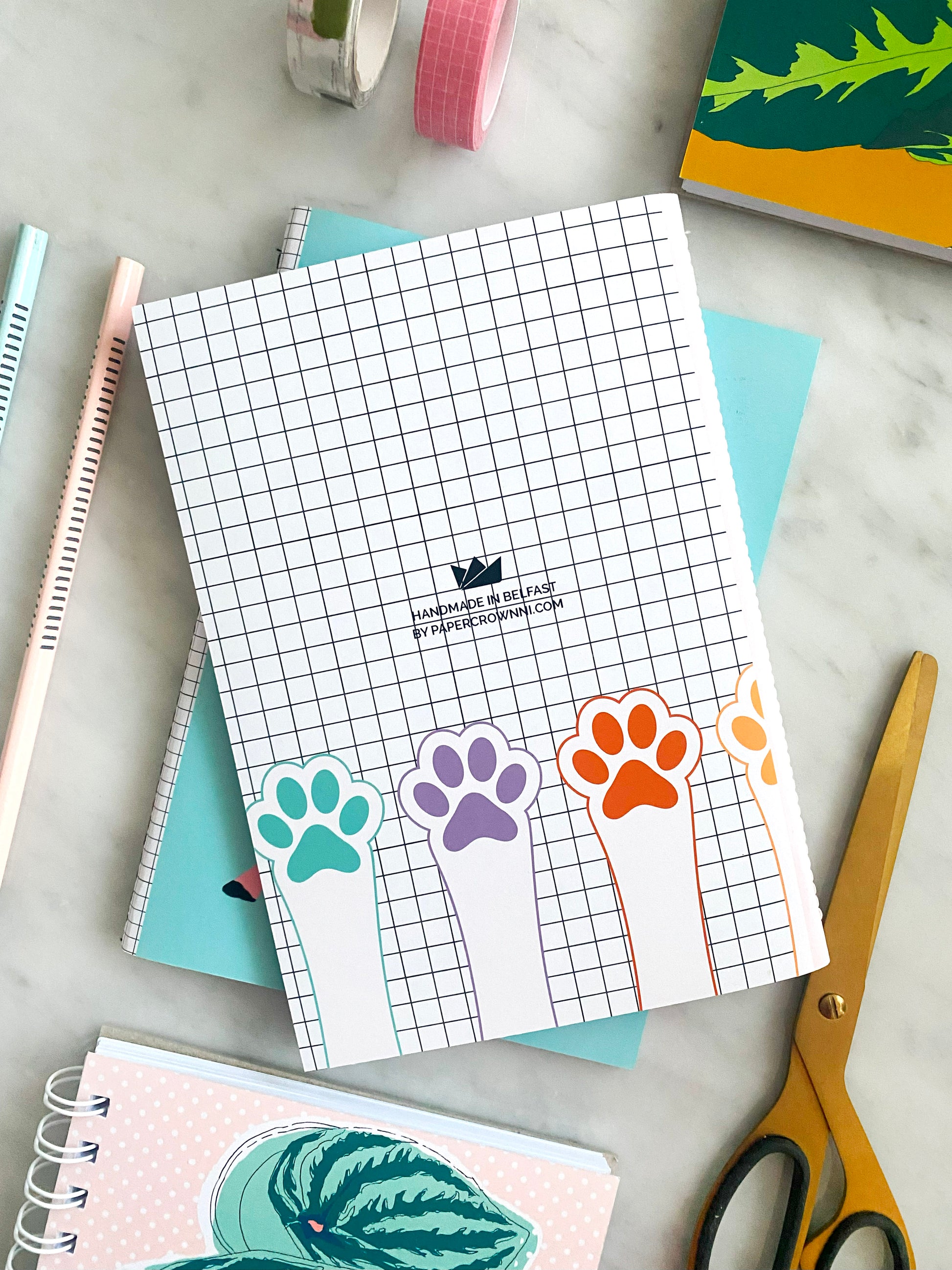 Softcover A5 notebook with a bright and modern illustration of cat paws and toe beans!