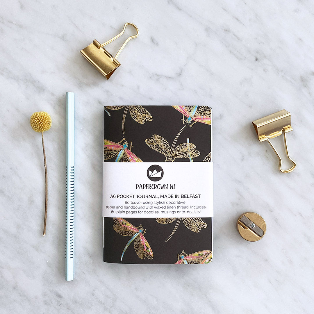 A6 softcover pocket journal with a stunning Dragonfly design, including subtle metallic detailing. This notebook has been handmade in Belfast and has been bound using waxed linen thread. It also has rounded corners for extra cuteness (and practicality!). It includes 60 plain pages for your doodles, musings or to-do lists! This is a bundle of two notebooks!