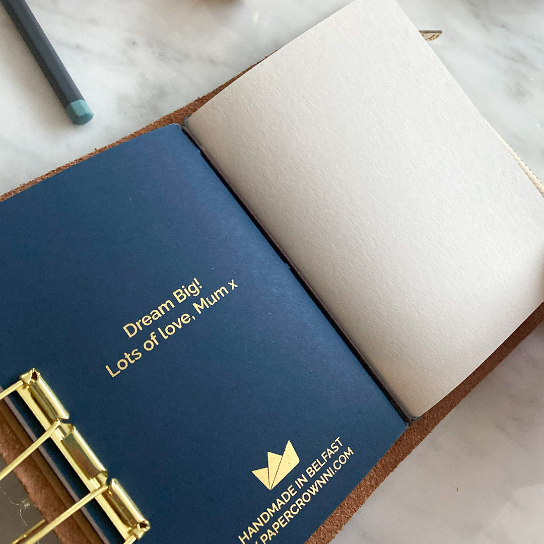 This leather journal has been designed and made BY a woman FOR women! It has been created with a considered colour palette of rich tan, navy and taupe; and includes a number of inspirational quotes by strong women to encourage and motivate as you navigate your chosen path. This is unquestionably a unique item of stationery, whether a self-care treat or special gift.