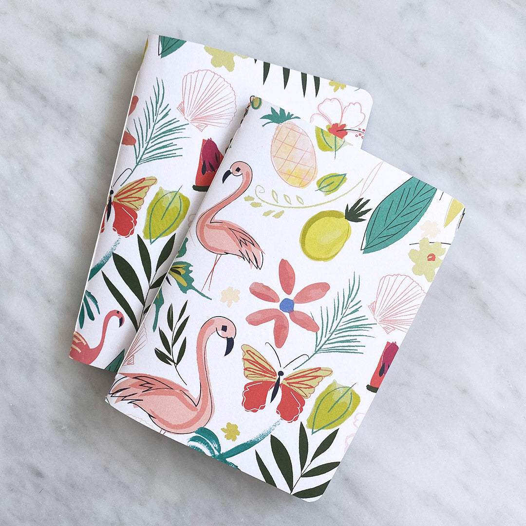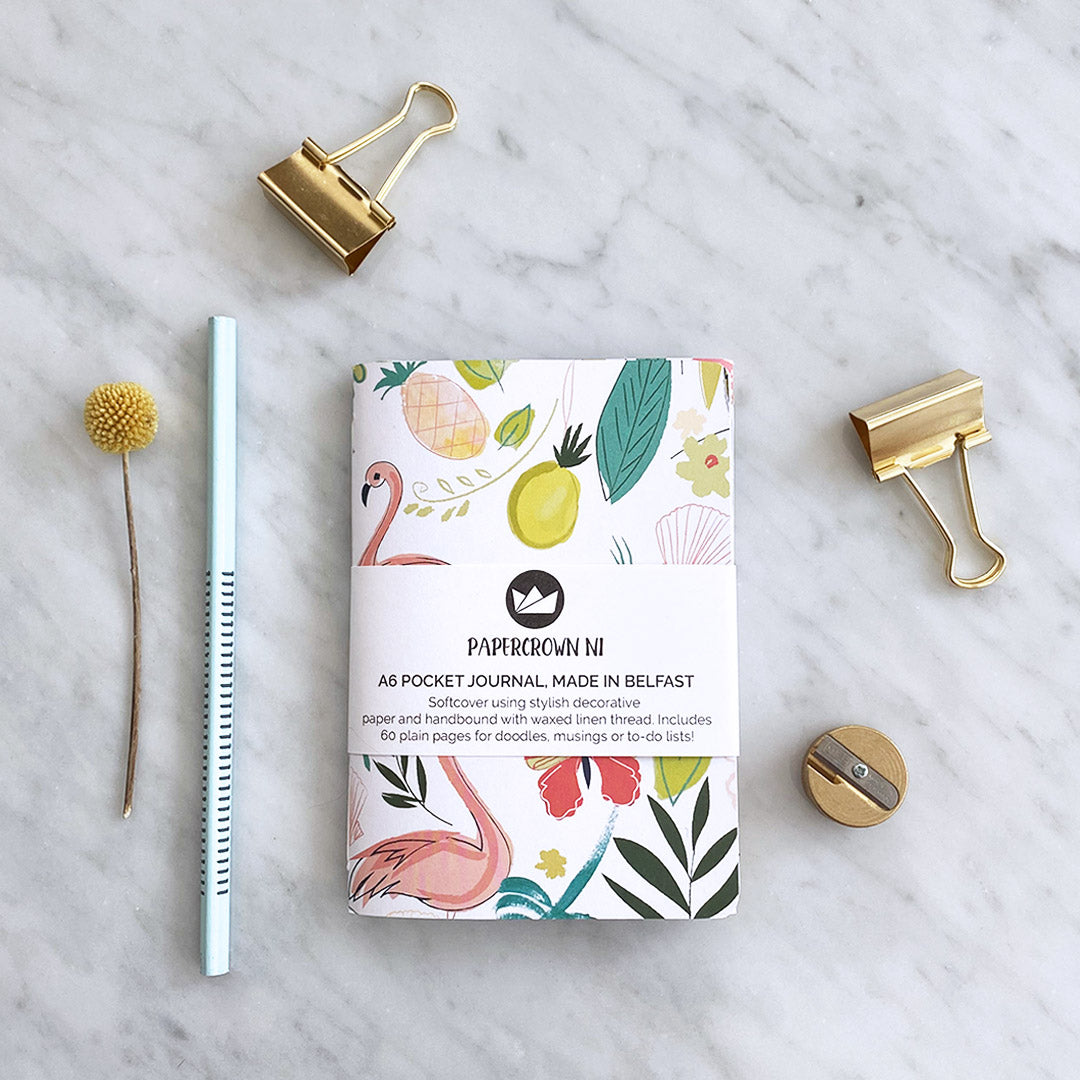 A6 softcover pocket journal with a fun botanical and Flamingo design. This notebook has been handmade in Belfast and has been bound using waxed linen thread. It also has rounded corners for extra cuteness (and practicality!). It includes 60 plain pages for your doodles, musings or to-do lists! This is a bundle of two notebooks!