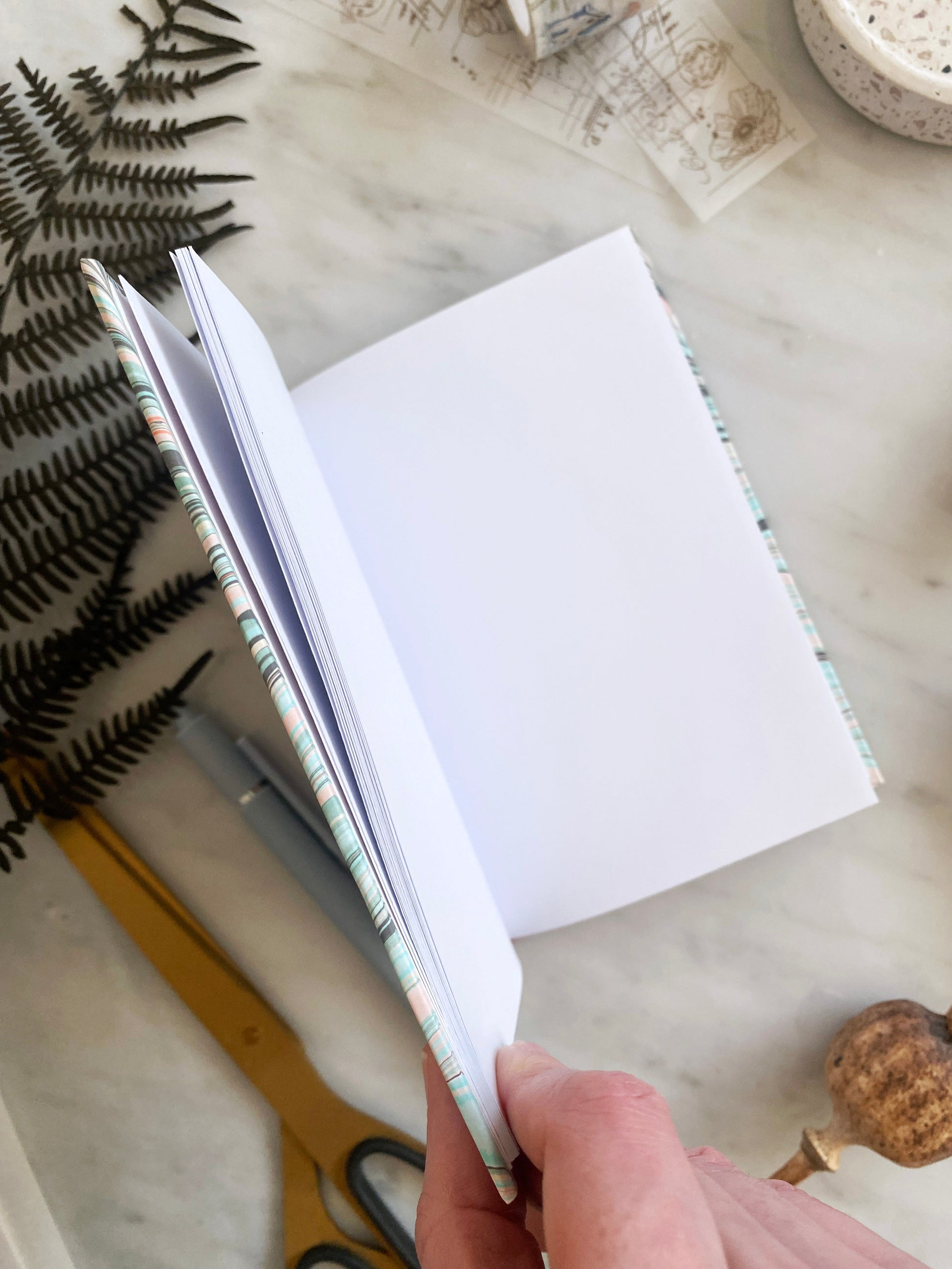 This handmade notebook includes 60 plain white pages of 80gsm paper; perfect for to-do lists, quick notes or journaling. This notebook is lay flat and has been bound using waxed linen thread.