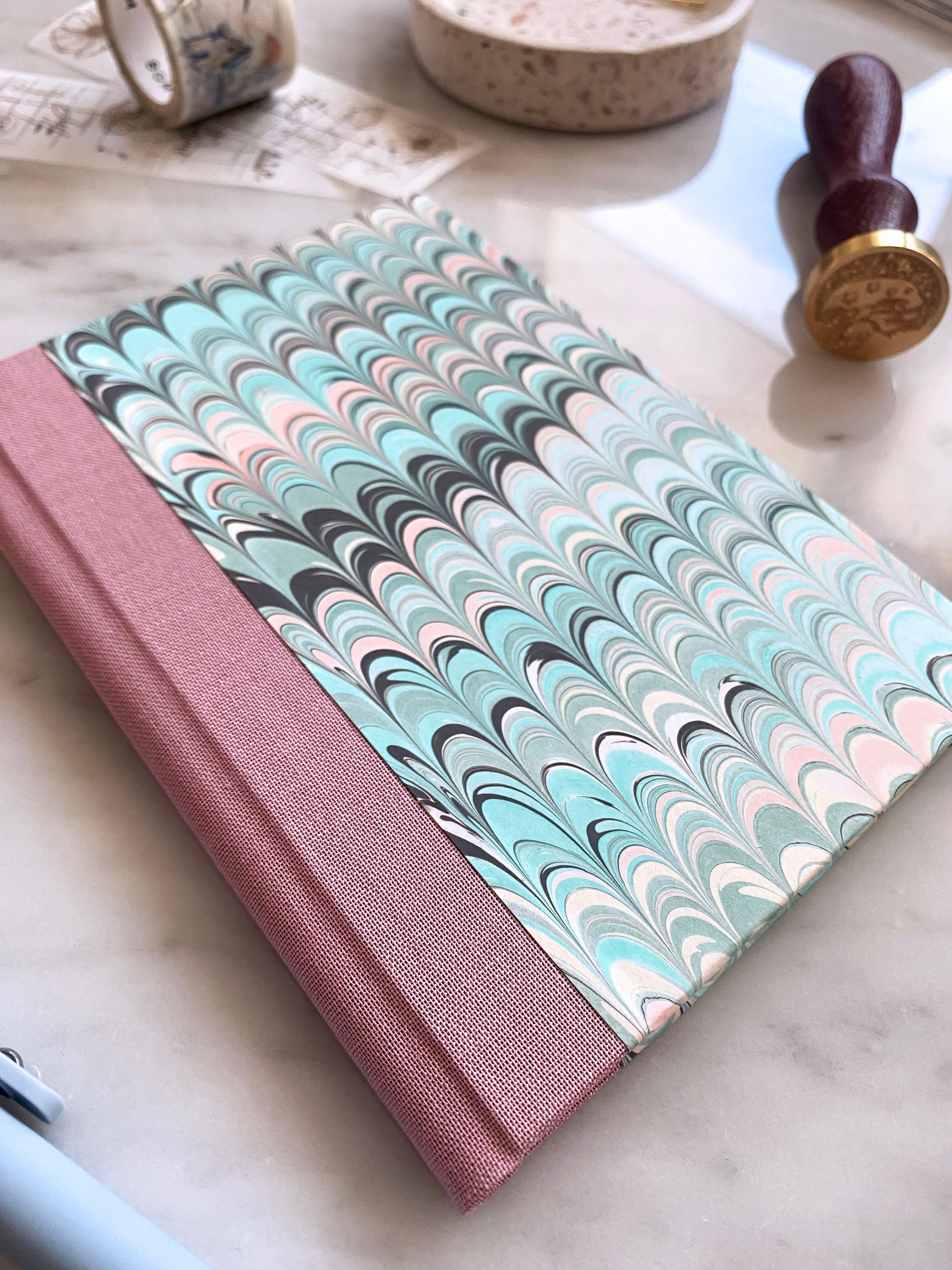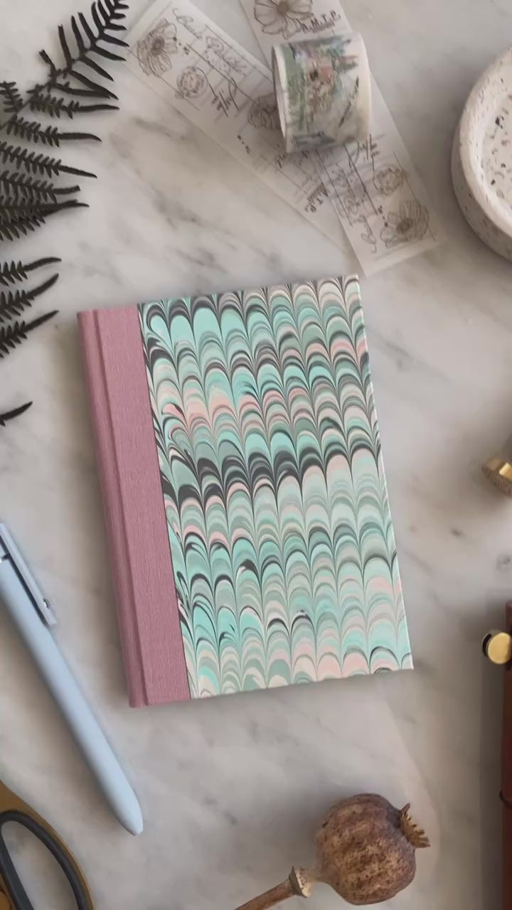 A6 pocket notebook covered using an authentic hand marbled paper (this is NOT a digital print!). with a complementary pink cloth spine. The hand marbled design includes a very subtle gold shimmer effect.