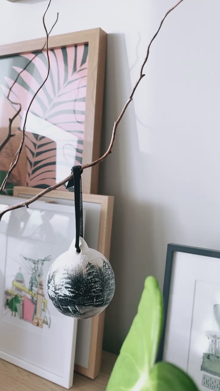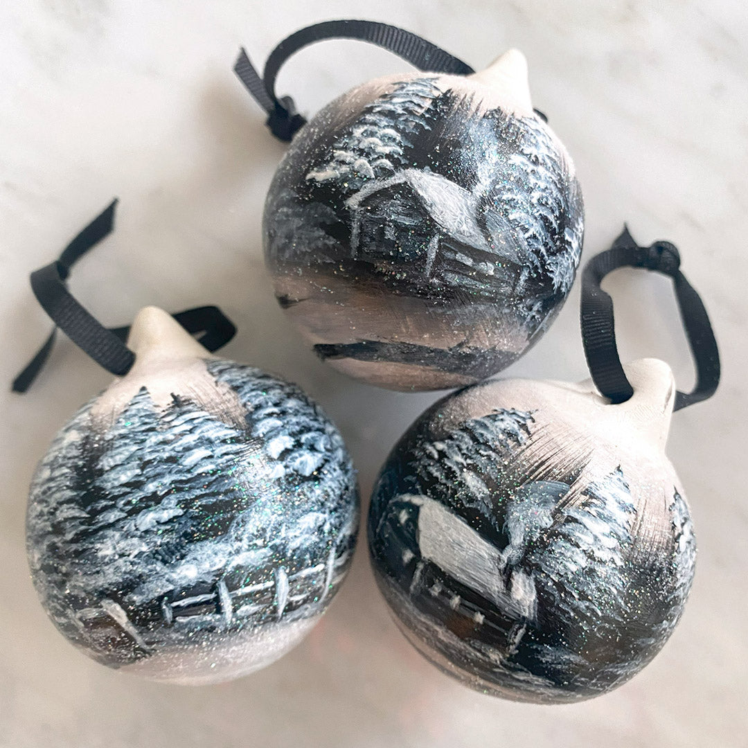 Beautiful hand painted Christmas tree decoration of a Winter forest scene complete with trees and a log cabin. Includes a luxe grosgrain black ribbon. Bauble is made of ceramic.