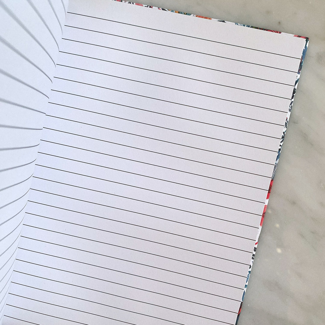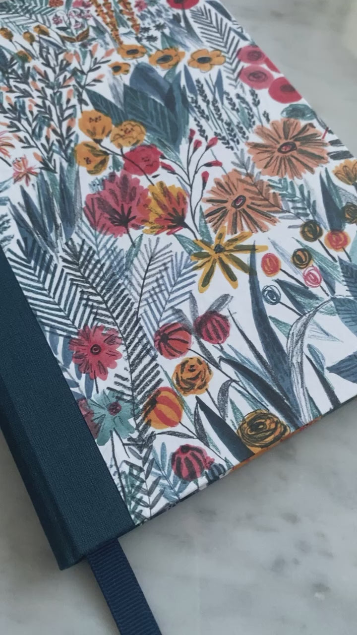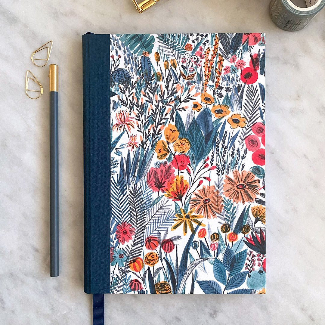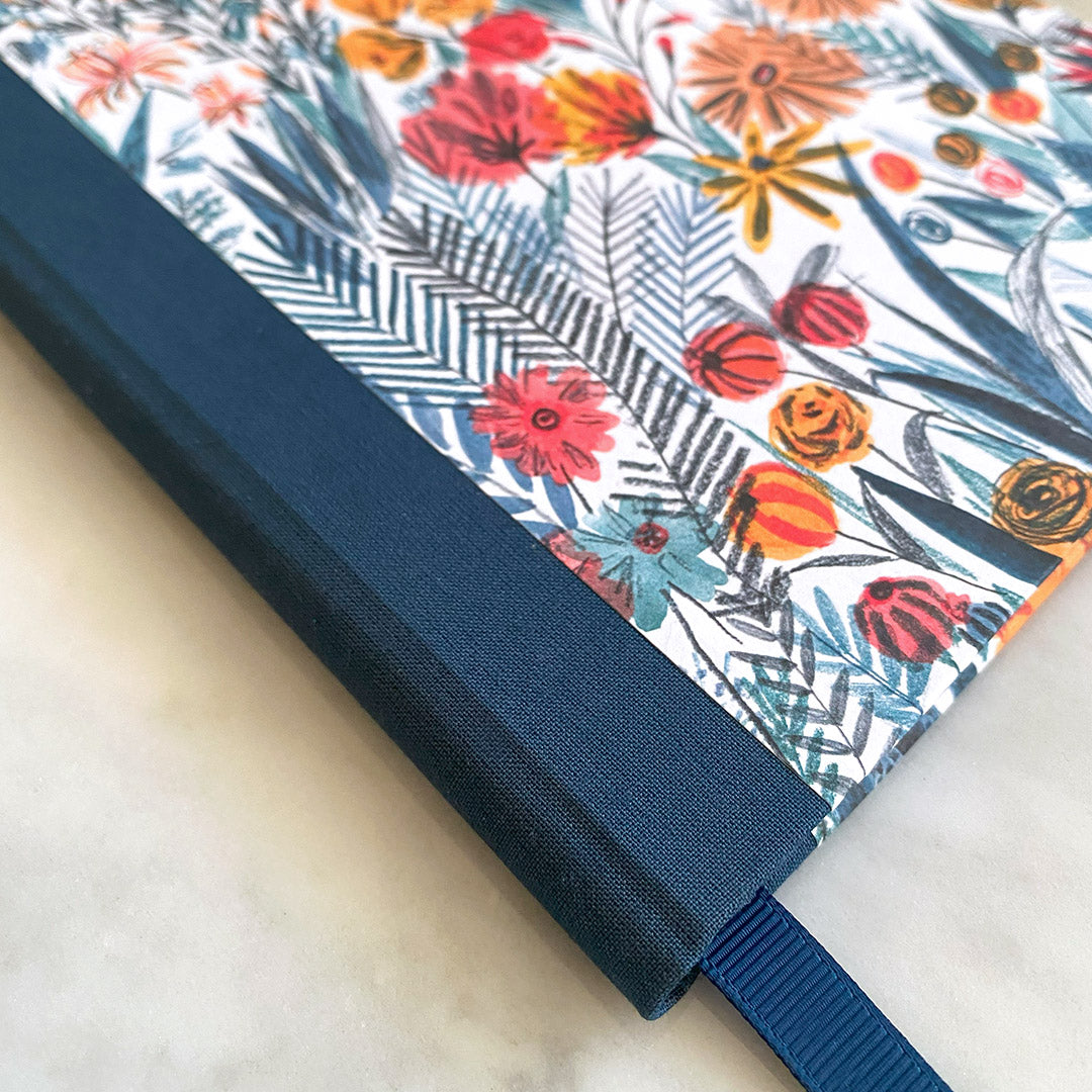 Hardback A5 notebook covered using a modern and uplifting floral print. Includes a complementary navy cloth spine and a matching luxe Grosgrain ribbon page marker.