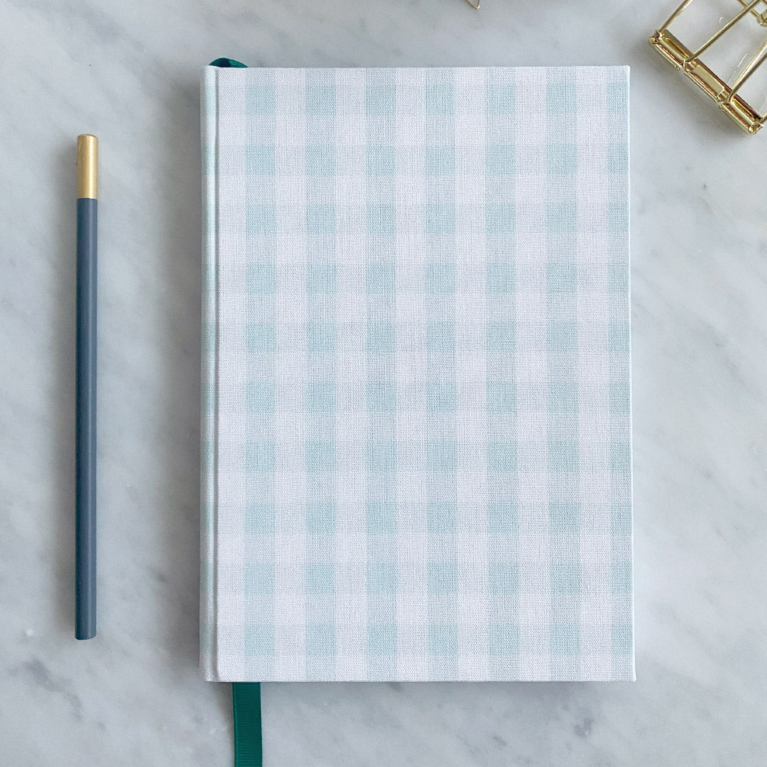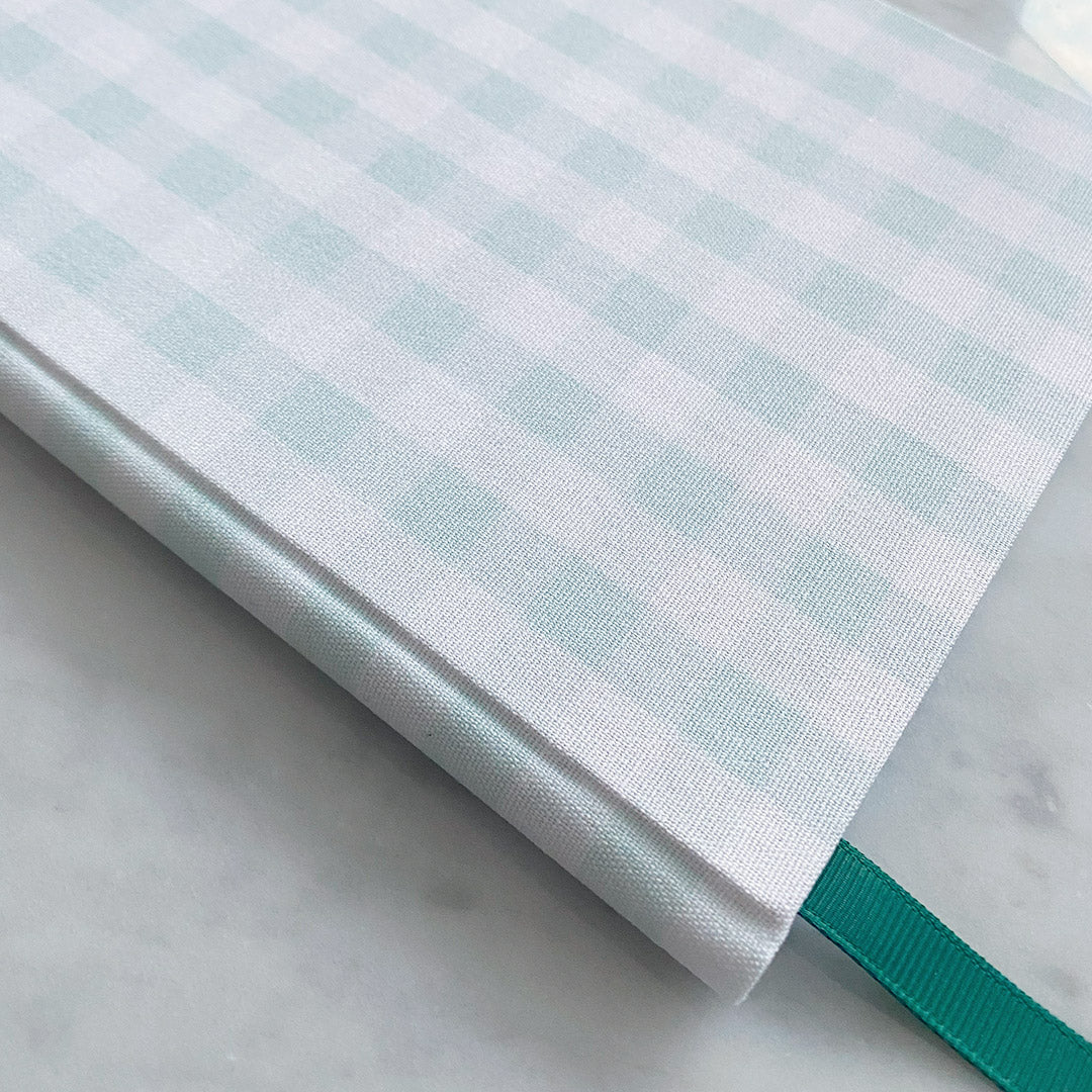 Hardback A5 notebook covered using a refreshing green Gingham pattern, includes a rich green luxe Grosgrain ribbon page marker.