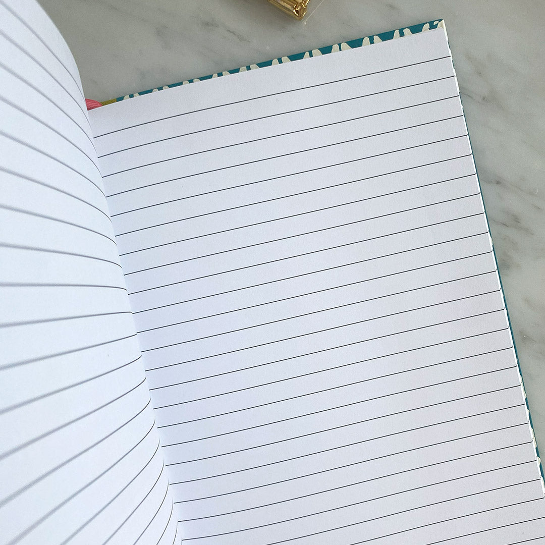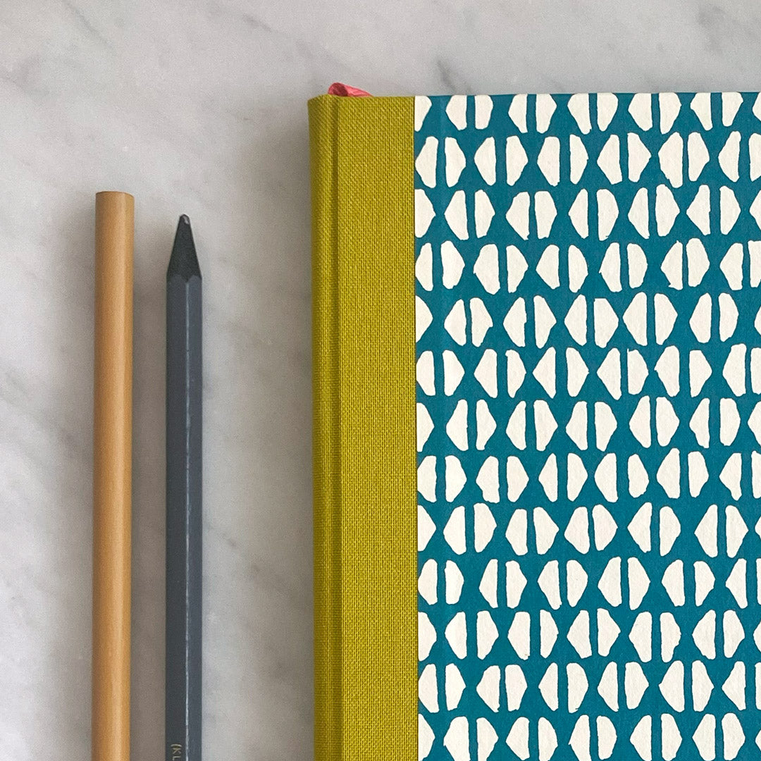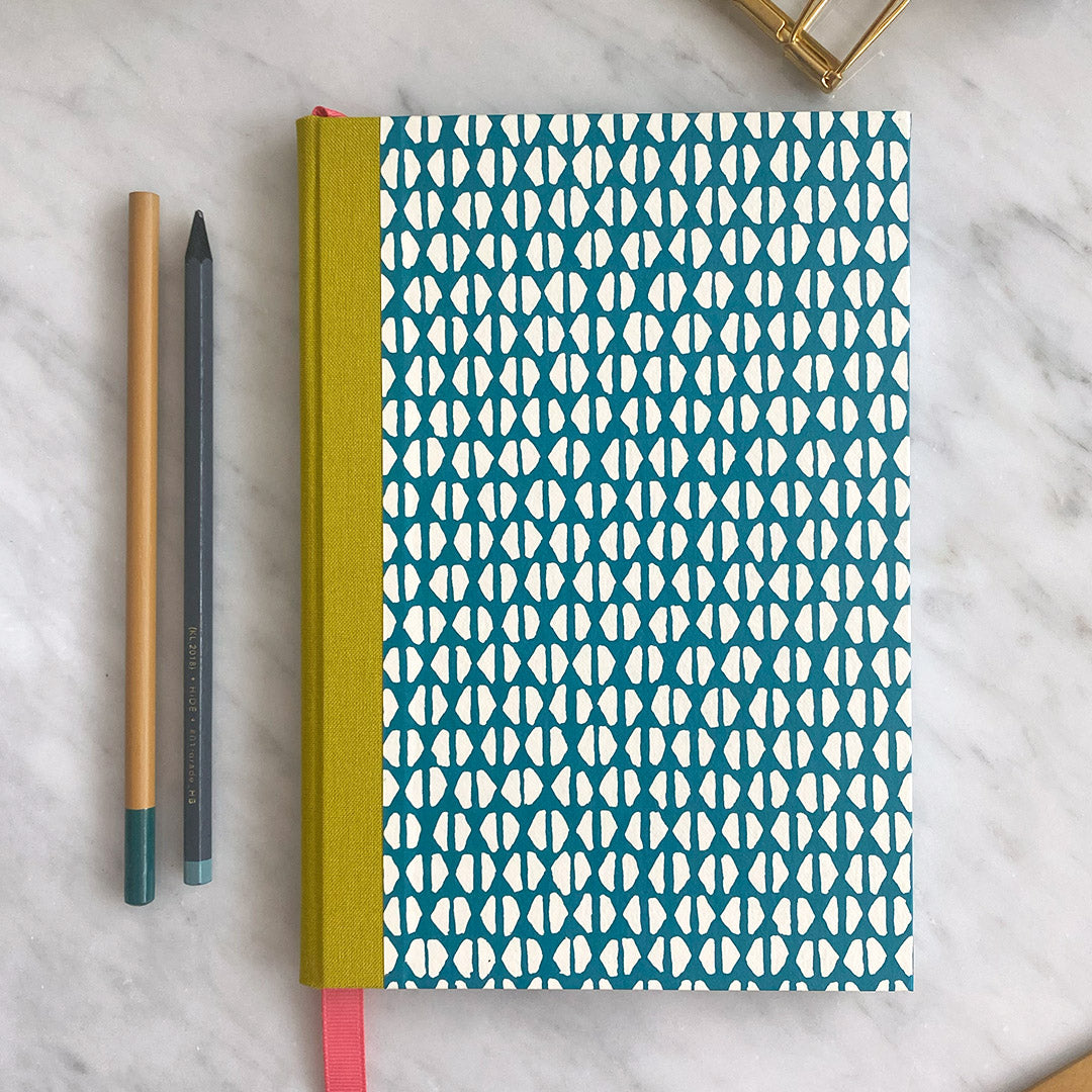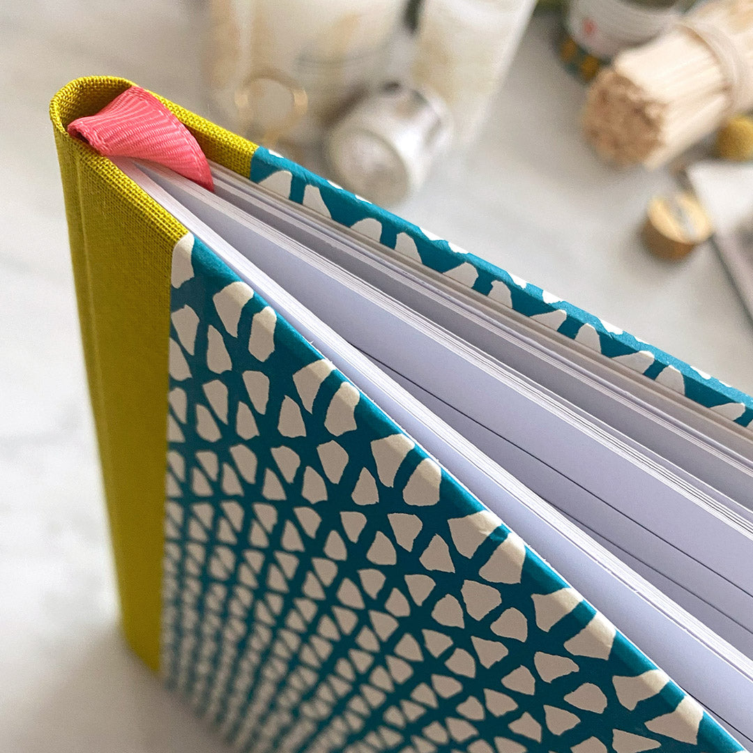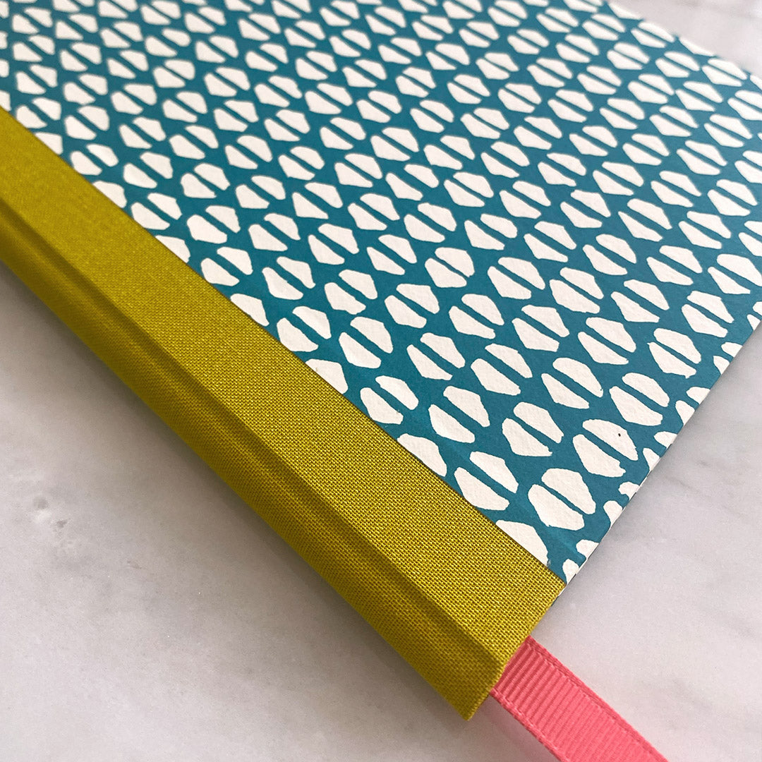 Hardback A5 notebook covered using a geometric pattern in Teal and off-white, includes a contrasting Chartreuse cloth spine and a luxe pink Grosgrain ribbon page marker, to create a fun and uplifting aesthetic.