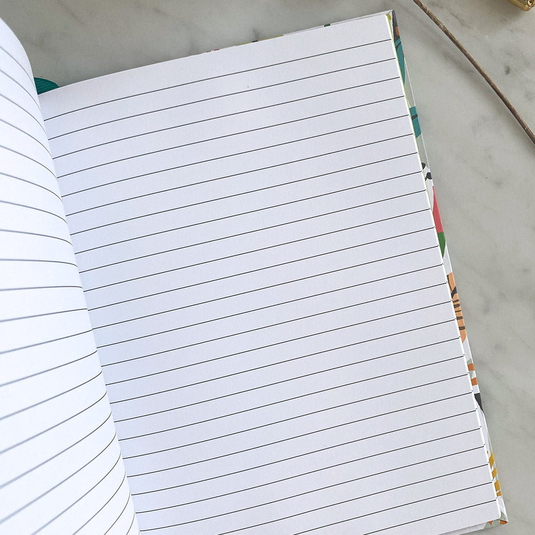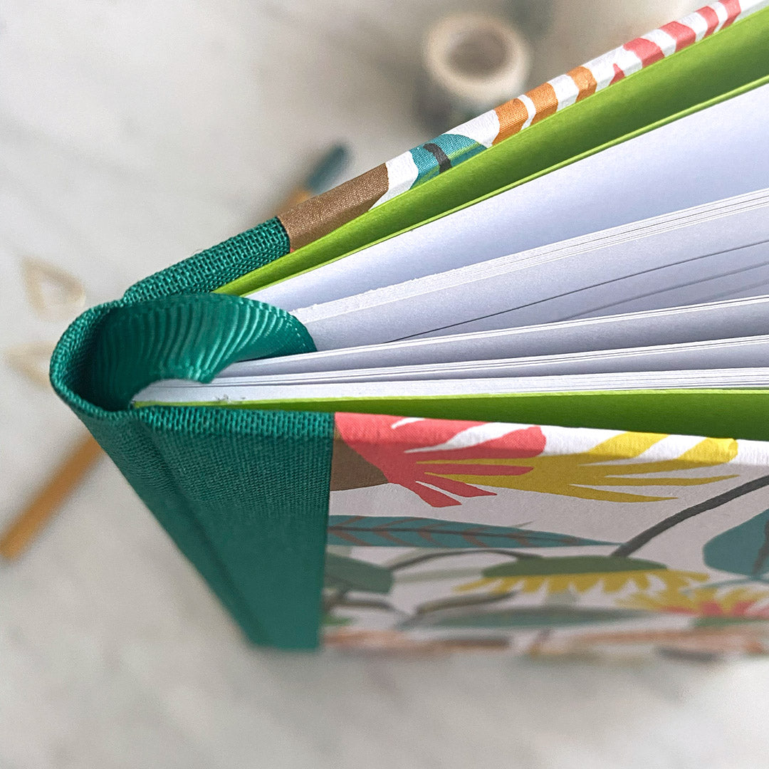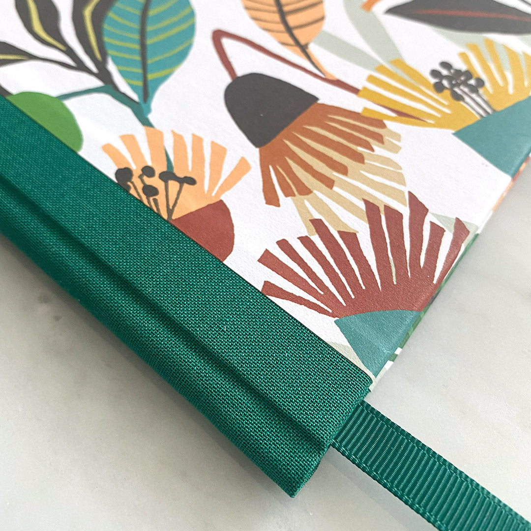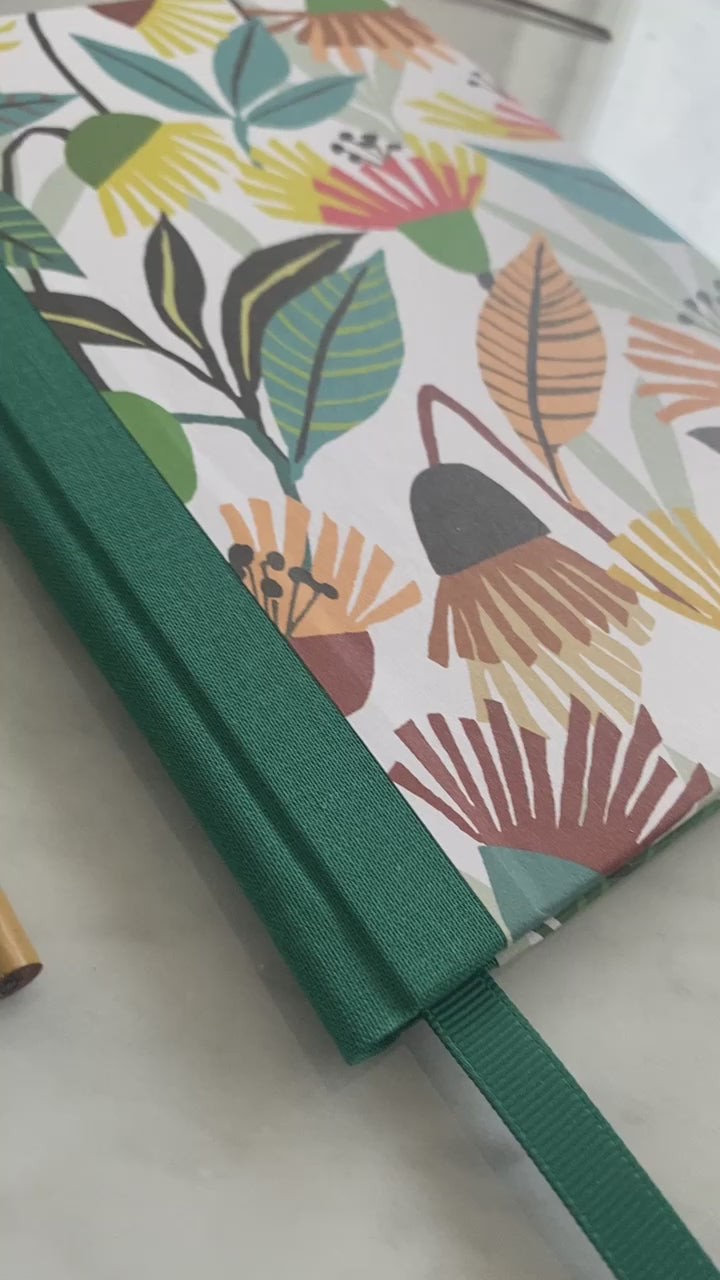 Hardback A5 notebook covered using a modern and uplifting floral print. Includes a complementary dark green cloth spine and a matching luxe Grosgrain ribbon page marker.