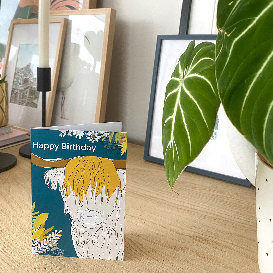 Original design of a sketched Highland Cow and cute flowers on a rich background. A6 card designed in Belfast. Printed in the UK on 100% recycled card and includes a Kraft envelope, with plastic free packaging.