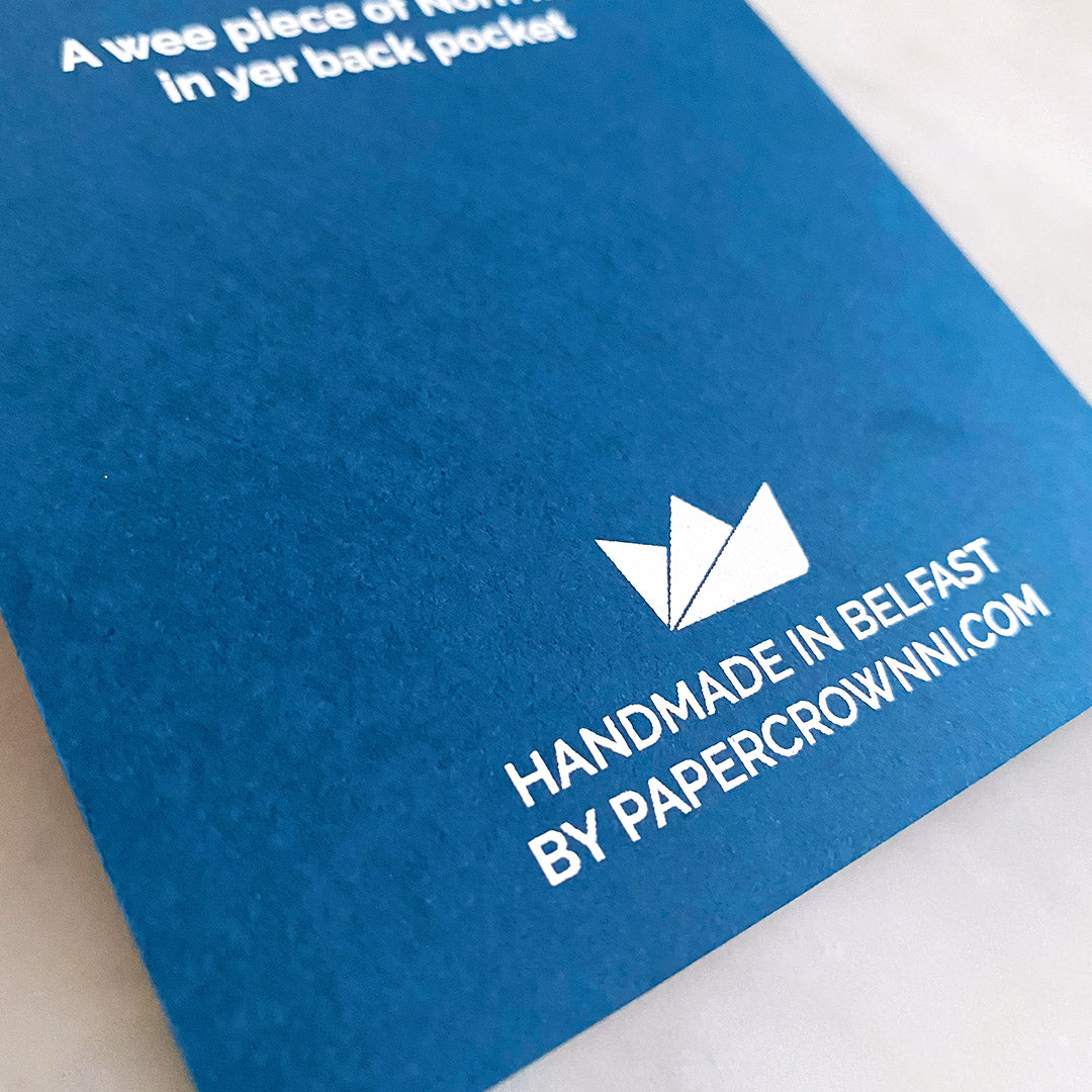 Can be customised with a special message on the reverse (by replacing/editing 'A wee piece of Norn Iron in yer back pocket', and comes with an optional gift box.
