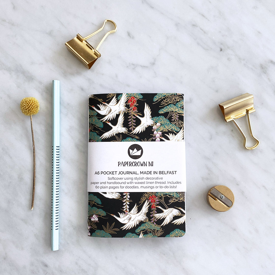 A6 softcover pocket journal with a stunning Crane pattern, screenprinted on handmade Japanese paper. This notebook has been made in Belfast and has been bound using waxed linen thread. It also has rounded corners for extra cuteness (and practicality!). It includes 60 plain pages for your doodles, musings or to-do lists! This is a bundle of two notebooks!