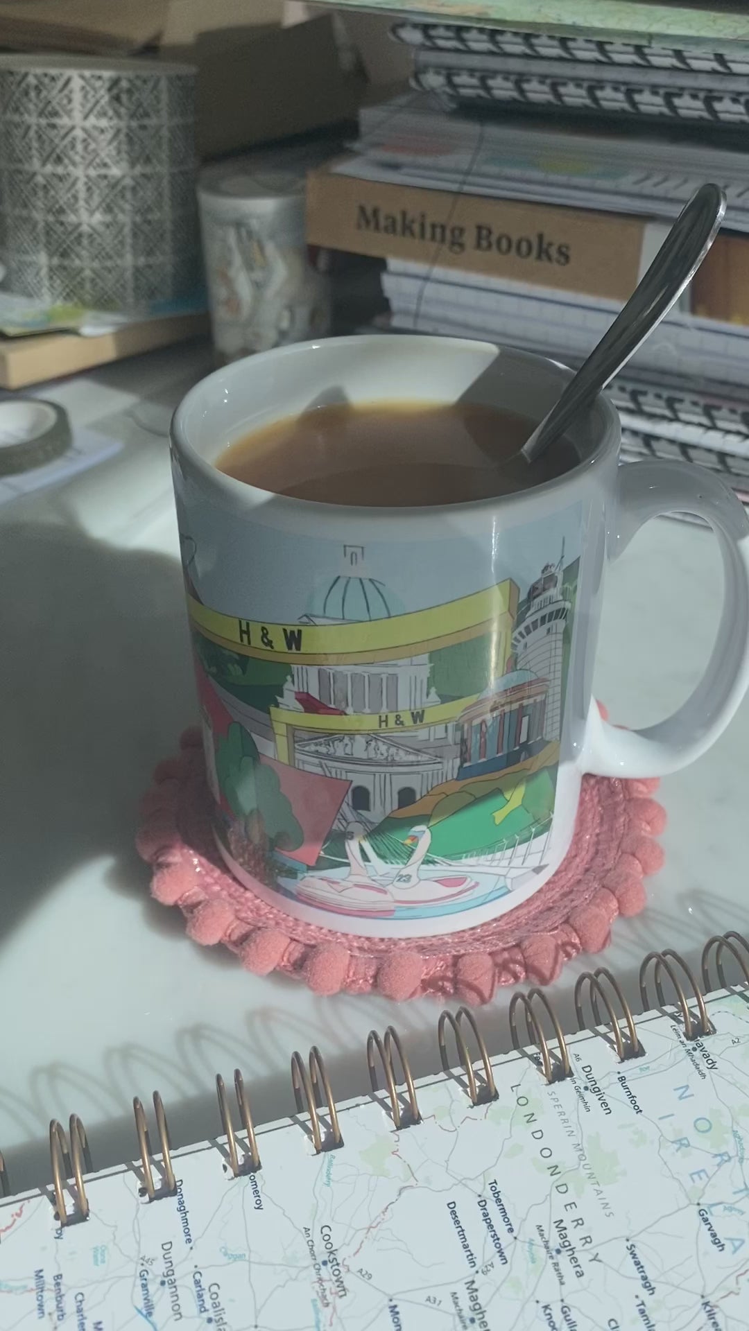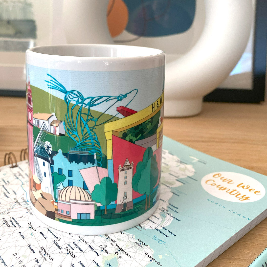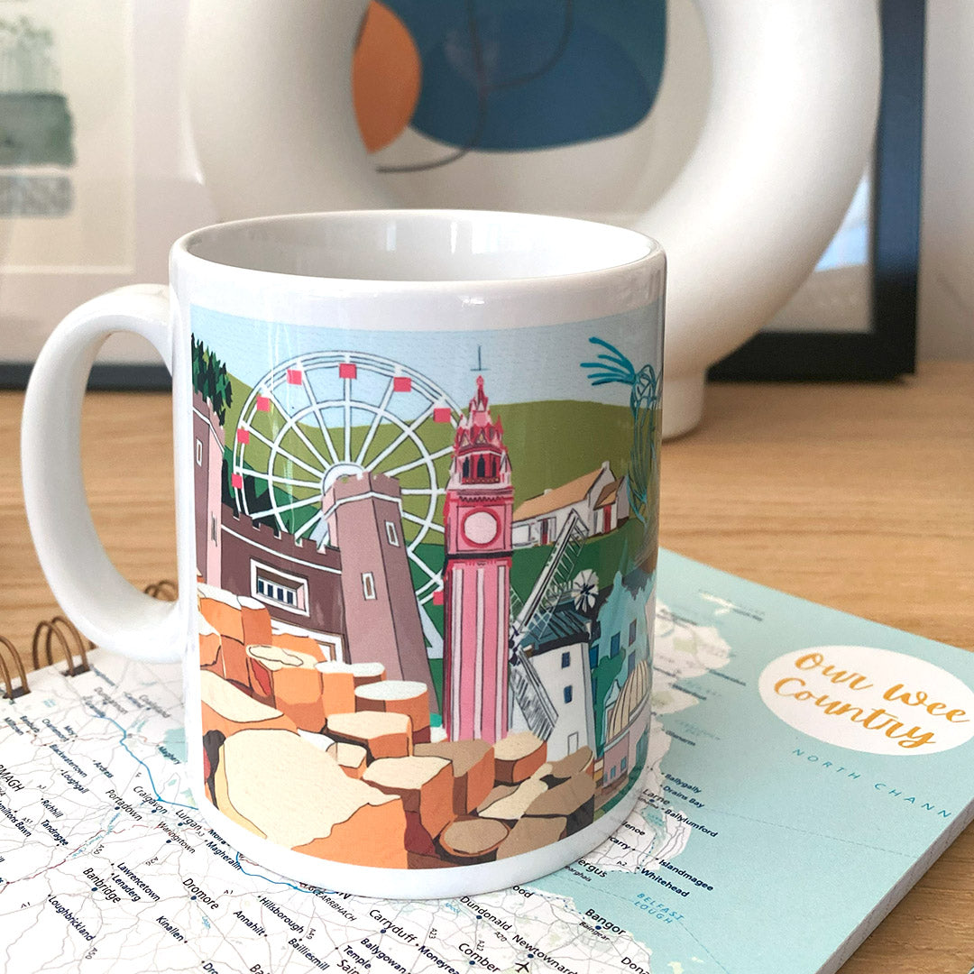 Original illustrations of some very well known Northern Ireland landmarks and icons on a mug! This mug has it all: the Harland & Wolff cranes; Belfast City Hall; the Bangor Swans; a cottage from the Ulster American Folk Park in Omagh; the Giant's Causeway and even the Peace Bridge in Derry/Londonderry.