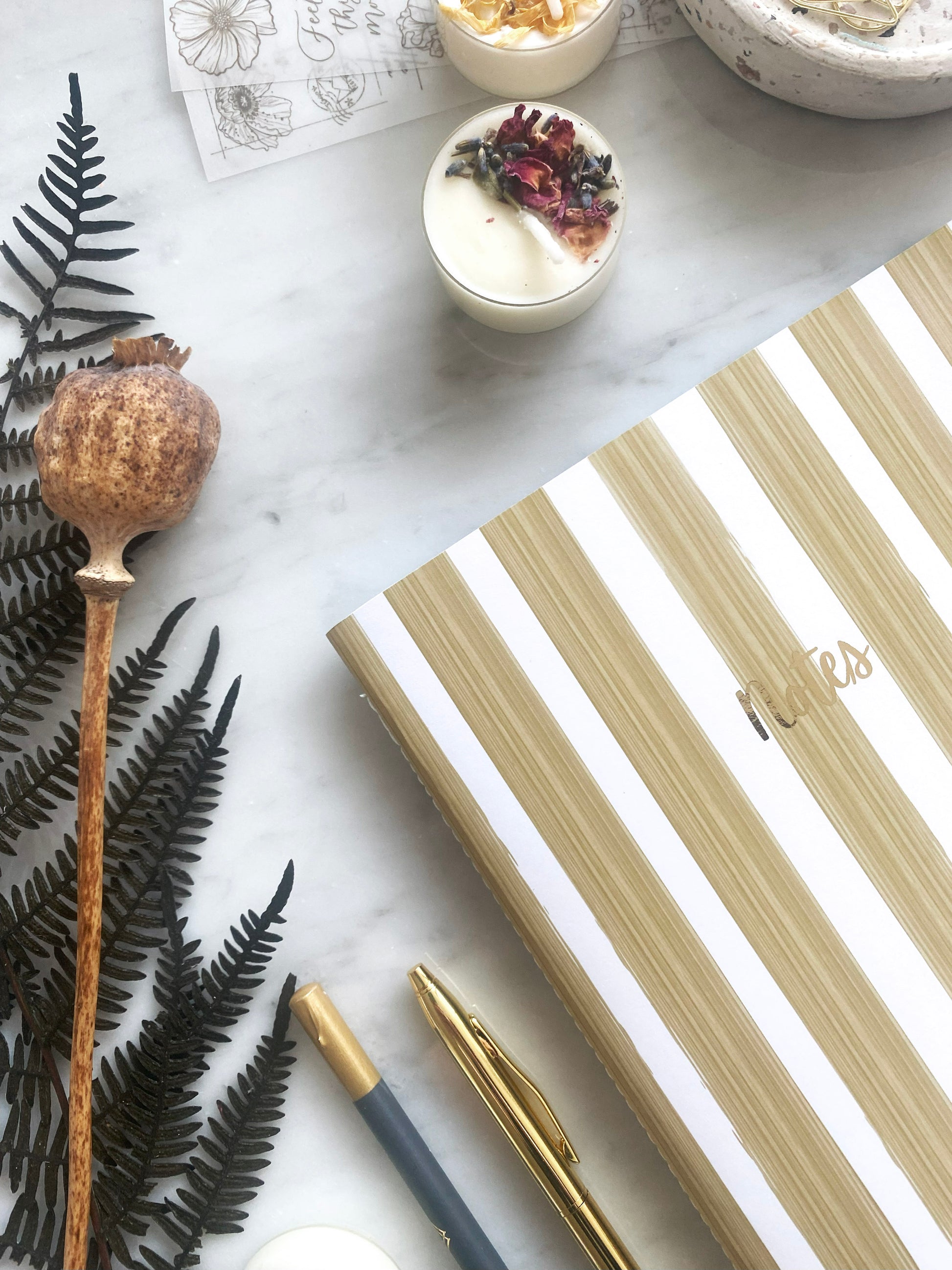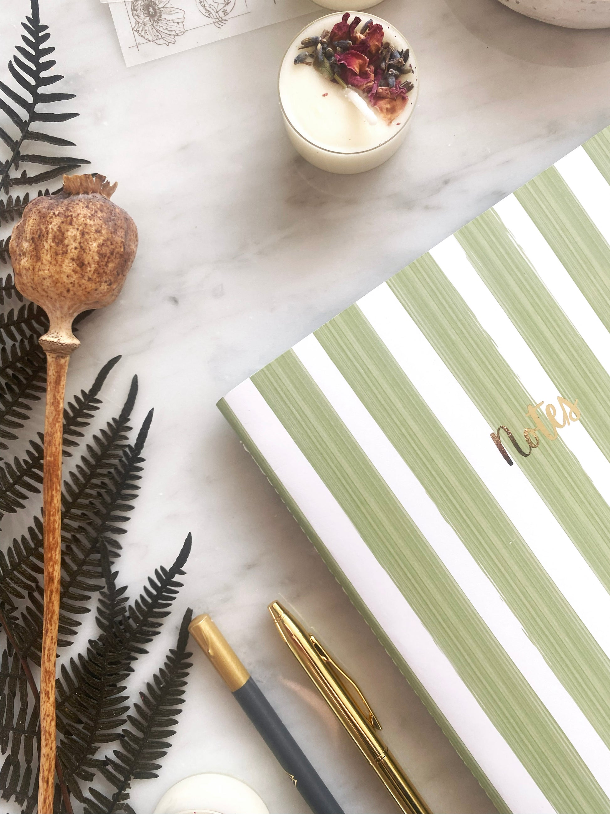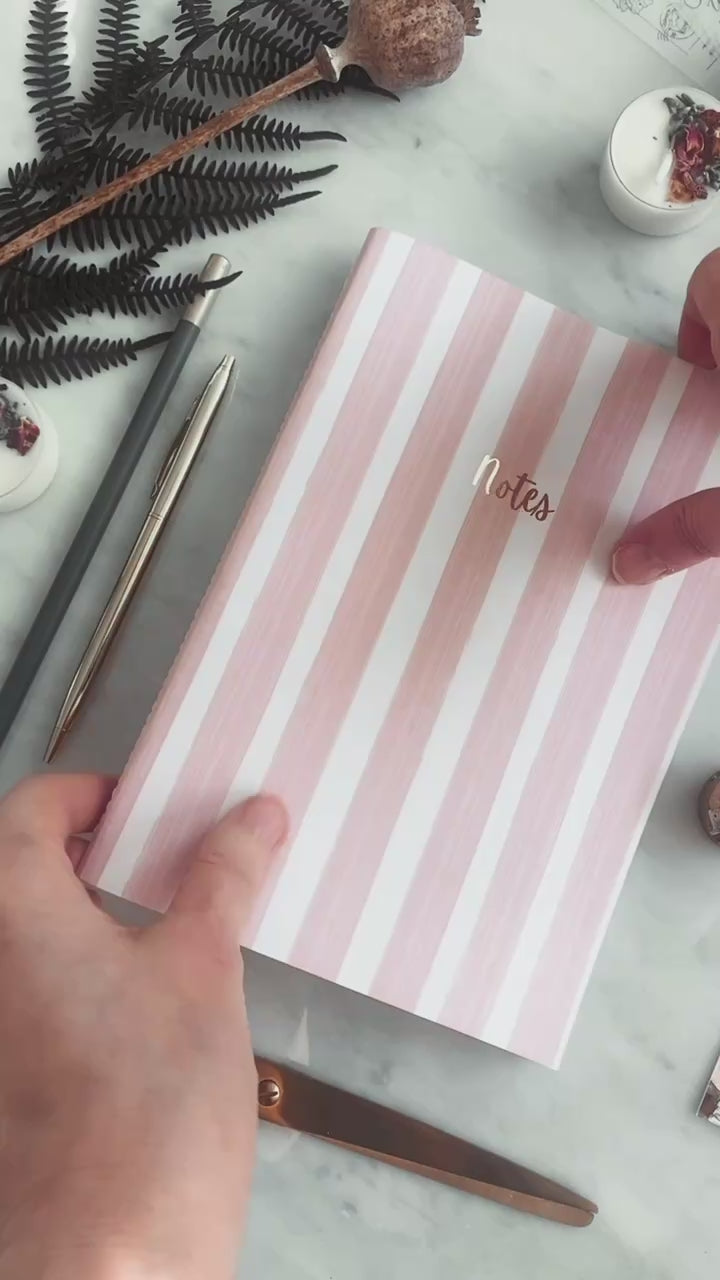 A beautiful (and very on trend!) handmade A5 striped notebook (pick your favourite of 6 colours!) with gold foiling, 60 lined, recycled pages and a beautiful machine sewn spine.