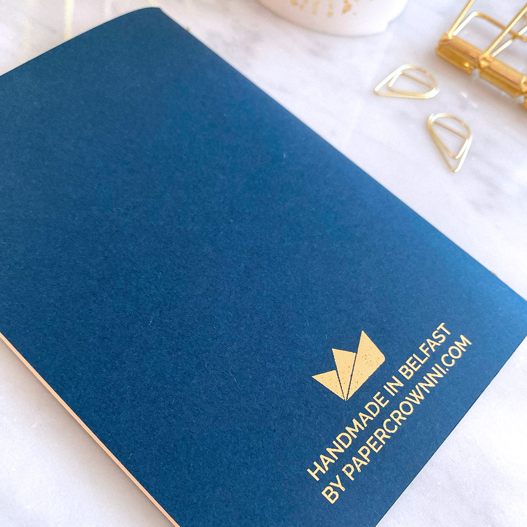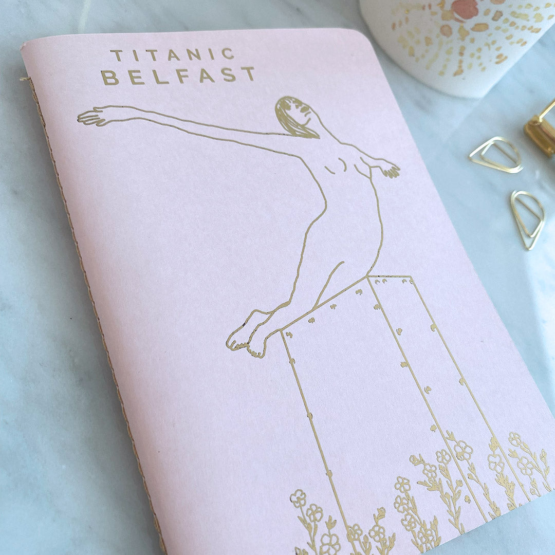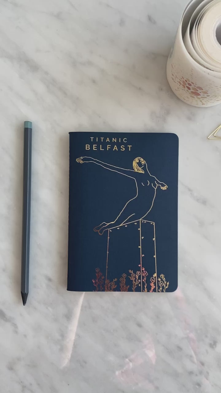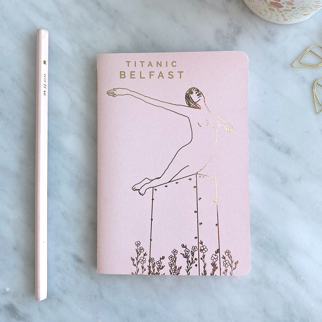 A6 softcover pocket notebook made using premium cardstock and gold foil, with an original illustration of Titanica; the beautiful sculpture that takes pride of place outside Titanic Belfast. The flowers at the bottom of this illustration are the Flax flower, which can be seen in the Titanic Hotel; the original HQ of Harland & Wolff.