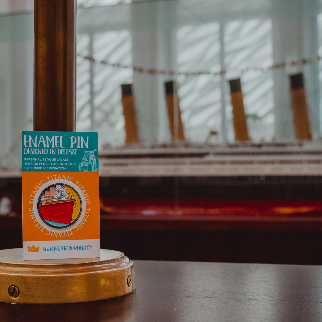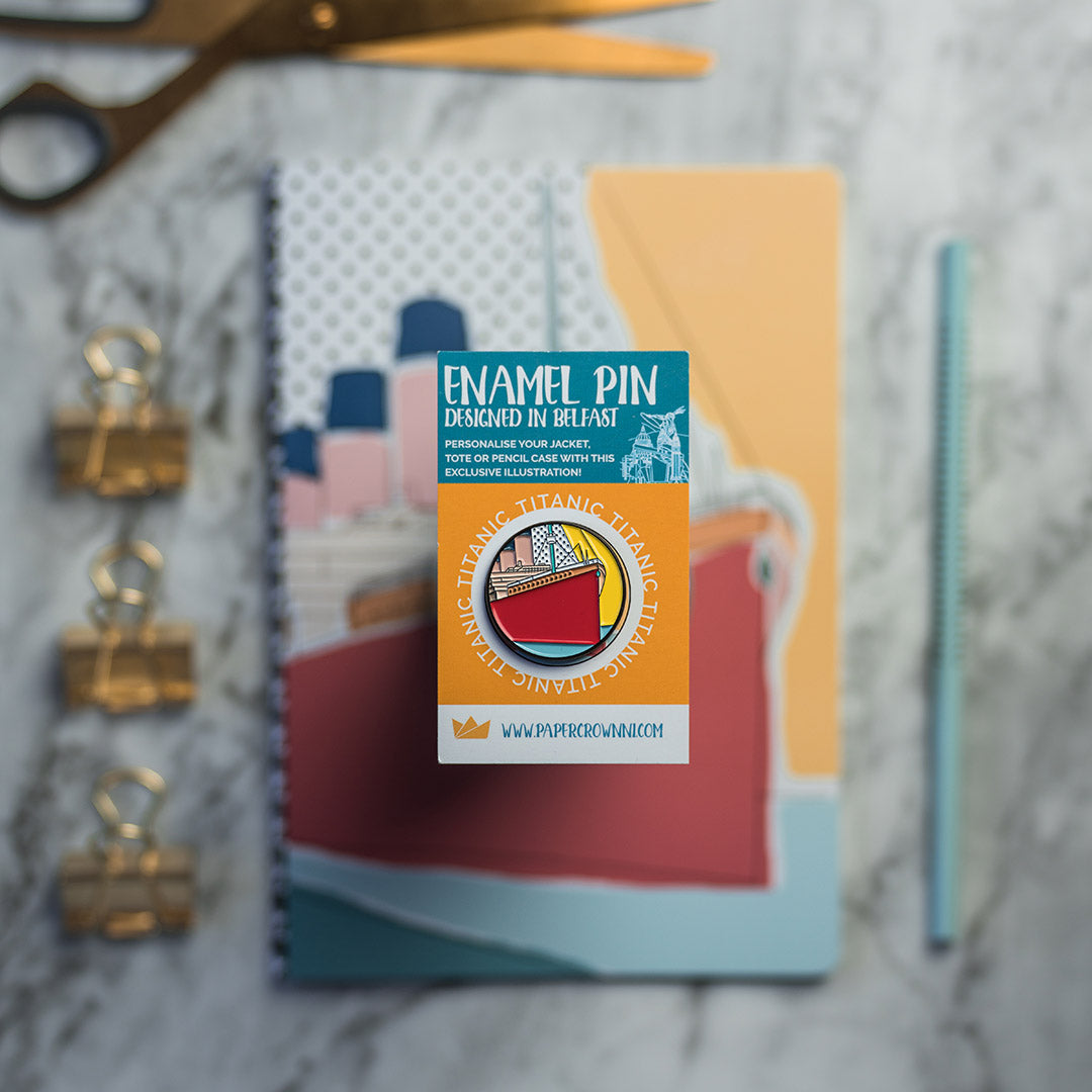 The Titanic on an enamel pin, with bright, uplifting colours and polka dots. Tres chic! Measures approx. 30mm in diameter and comes with a designer backing card.