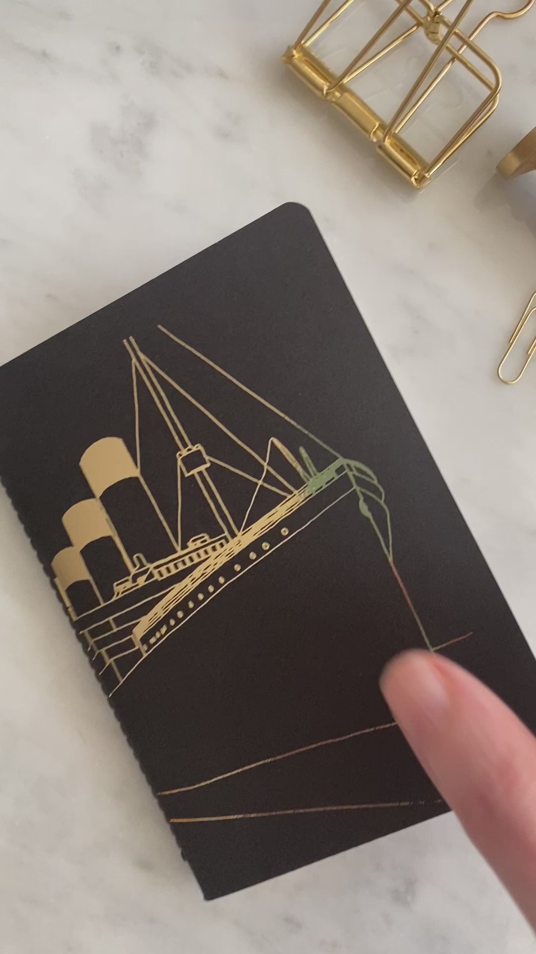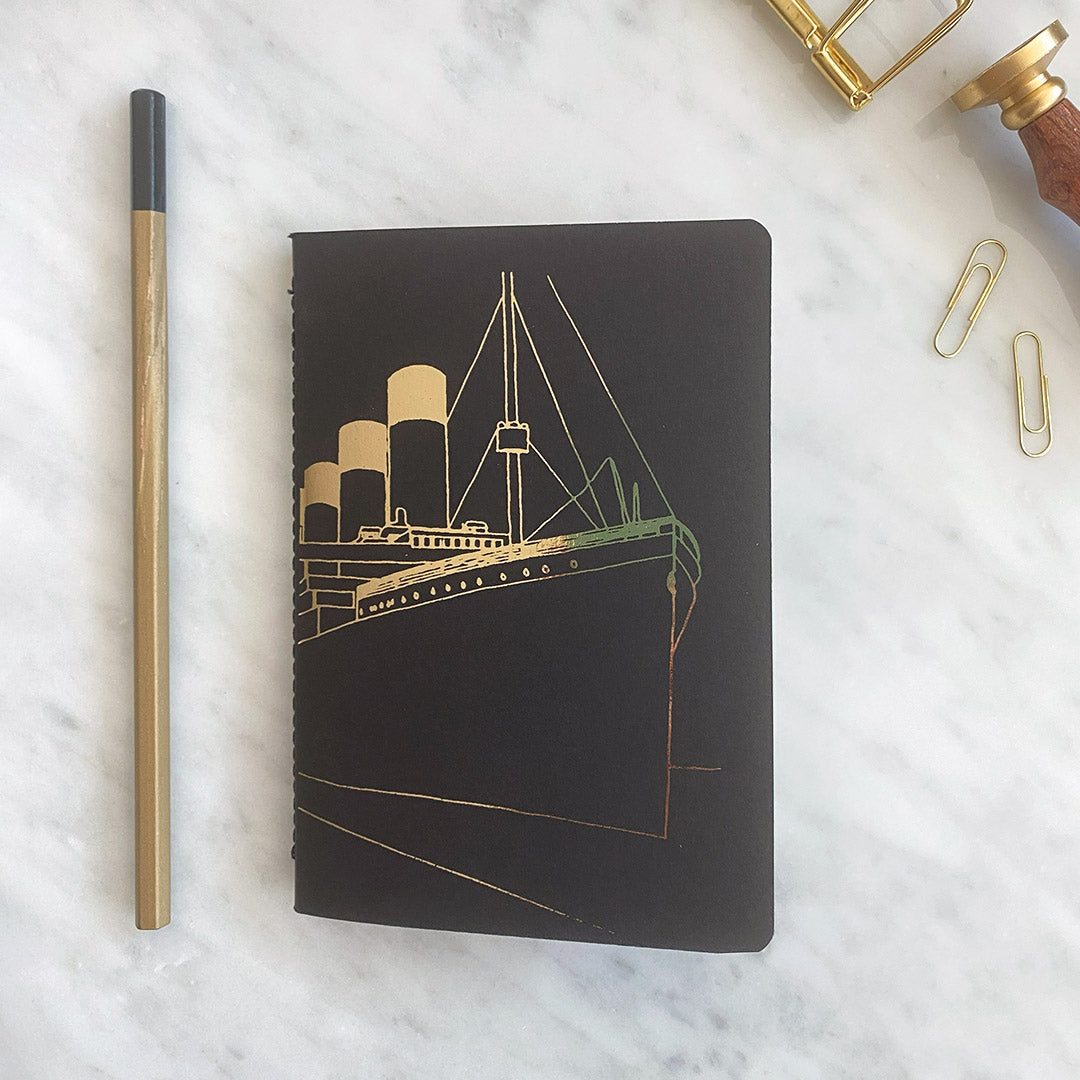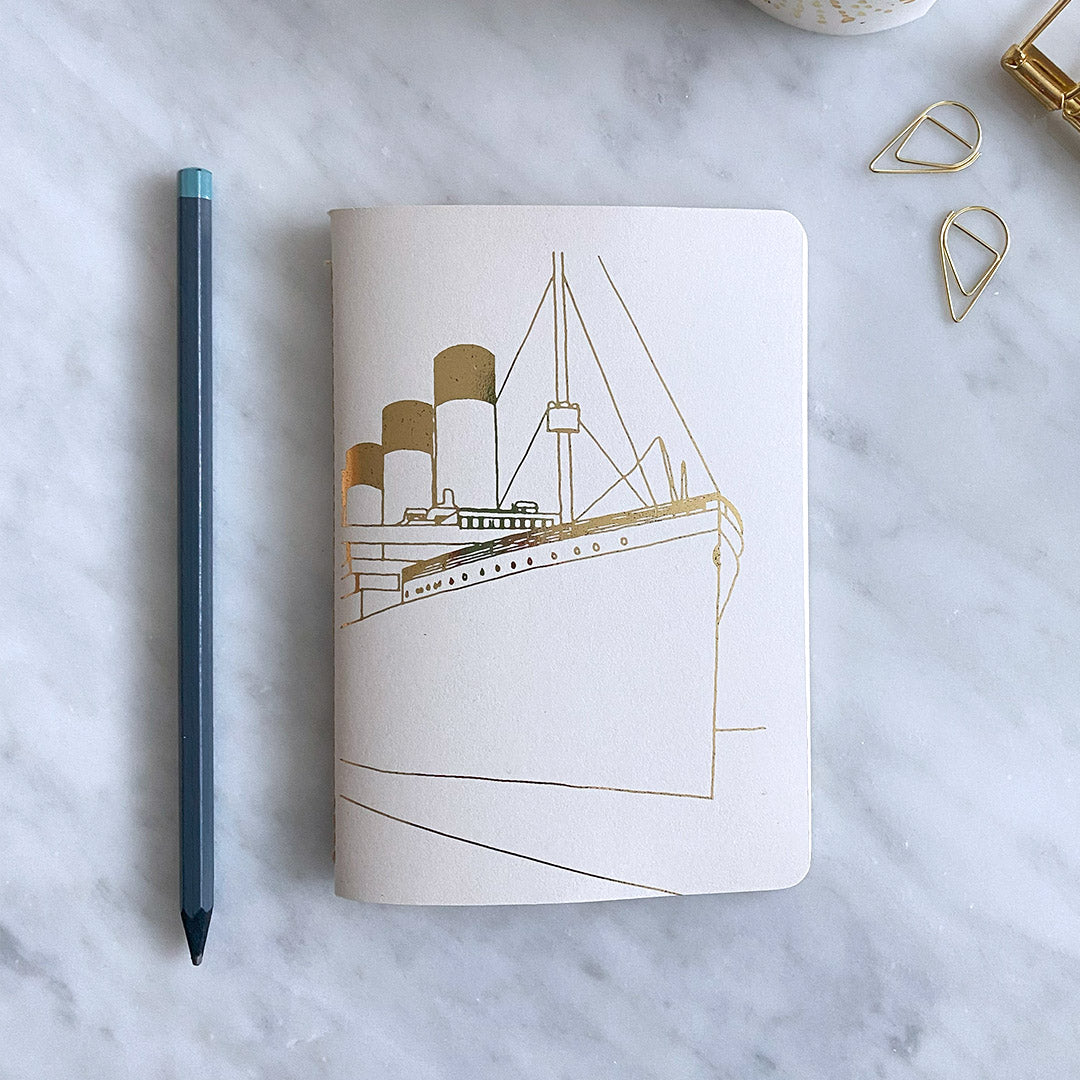 A6 softcover pocket notebook made using premium cardstock, with an original illustration of the RMS Titanic in gold foil. This notebook has been handmade in Belfast and has a machine sewn spine and rounded corners for extra cuteness (and practicality!). It includes 60 plain cream pages for doodles, measurements or to-do lists!