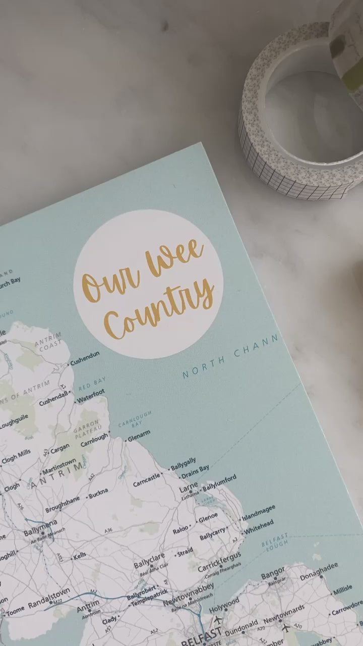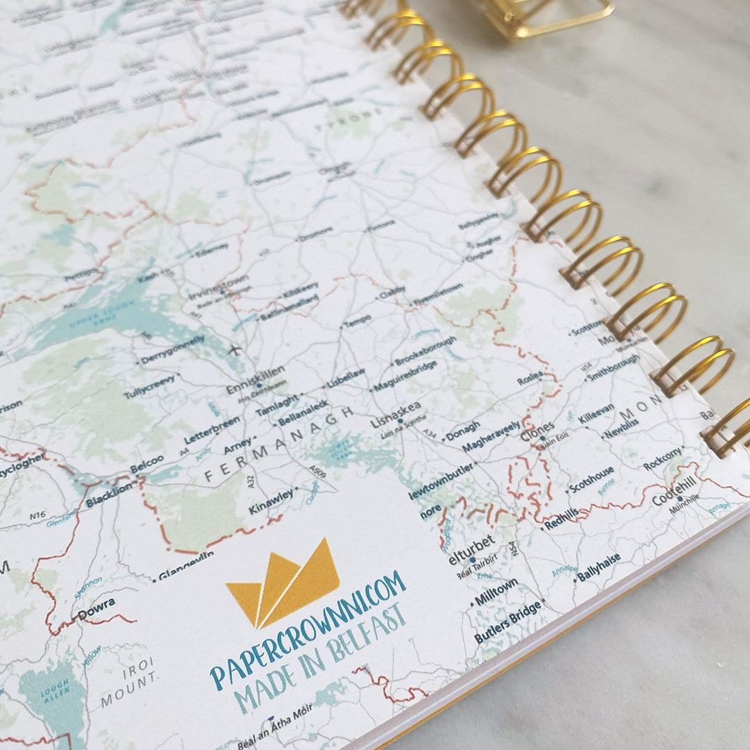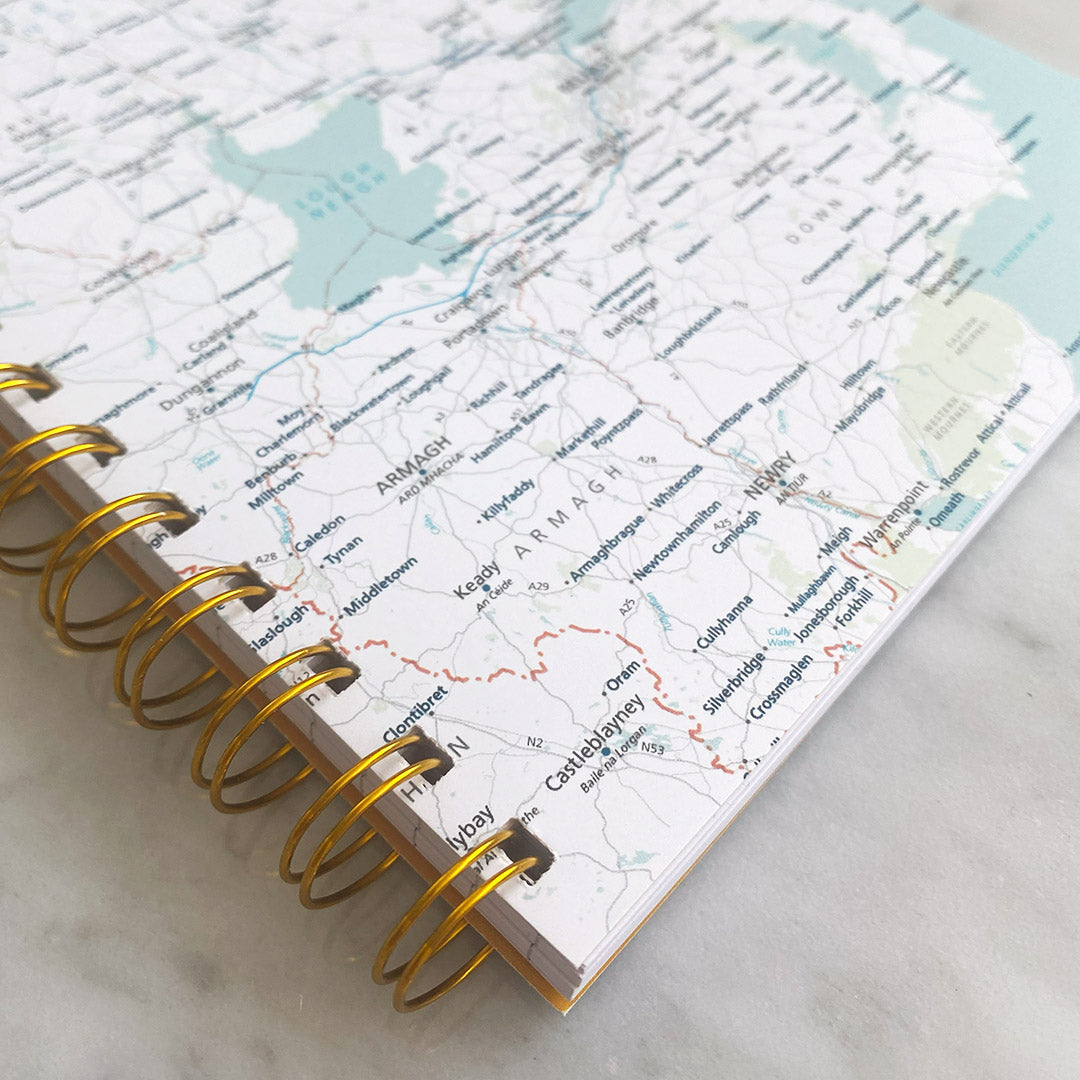Stunning A5 wirebound notebook featuring a Northern Ireland map on the front AND back cover, with extra thick 400gsm silk card. Finished with stunning gold wire binding.