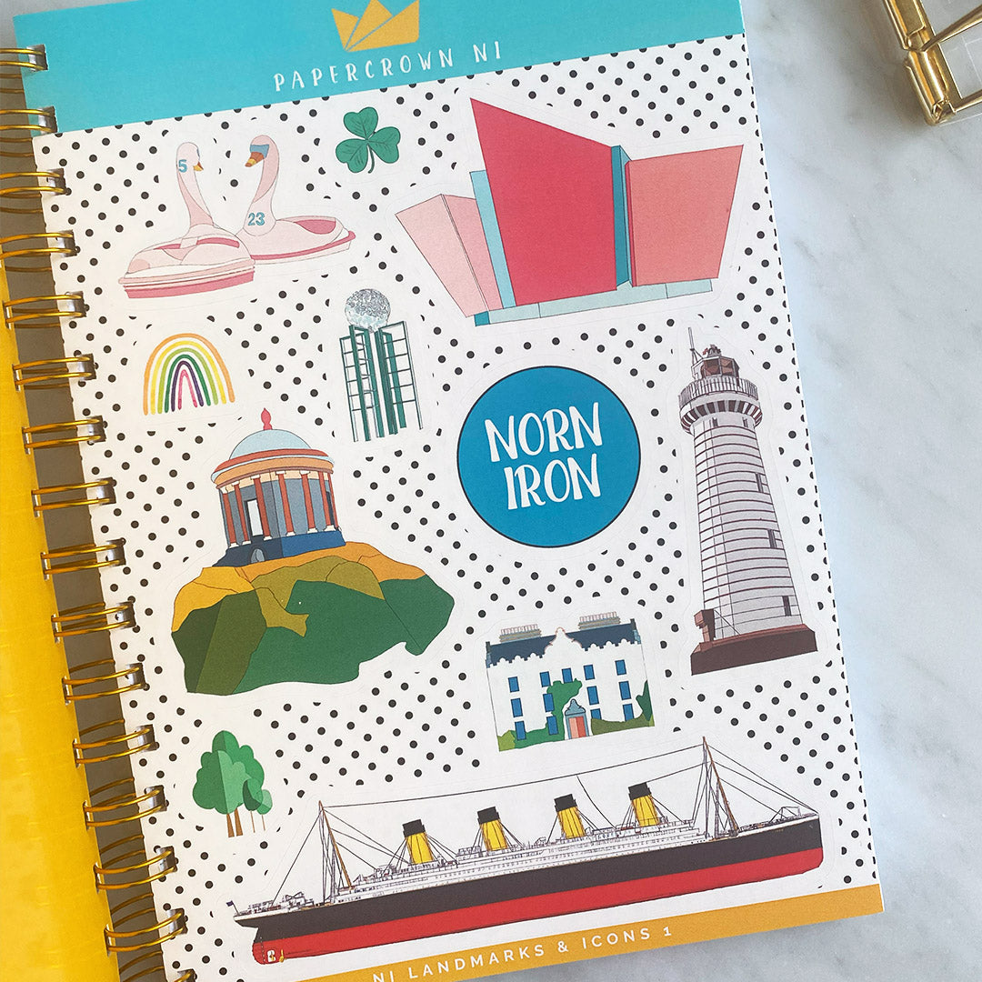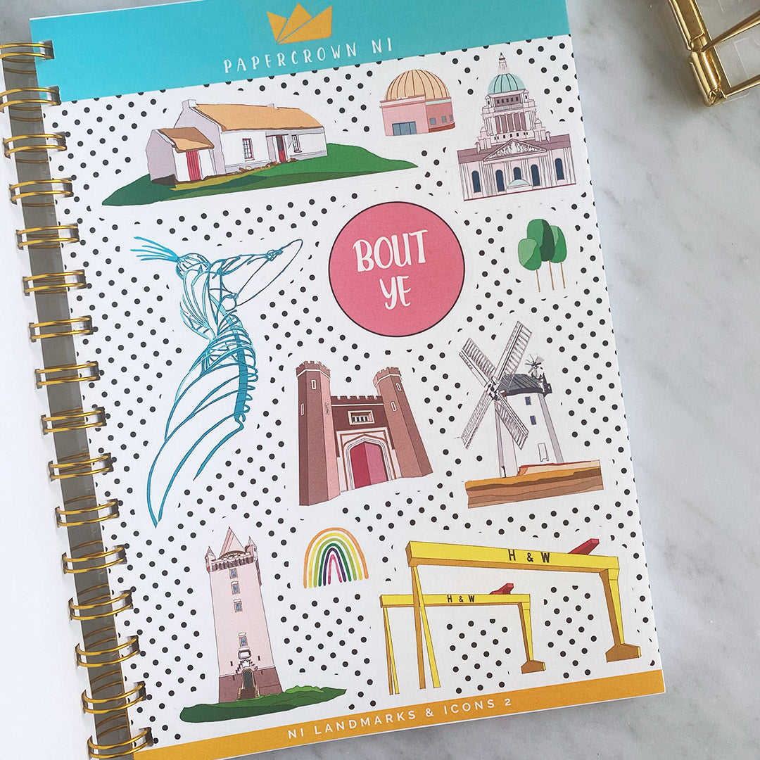 Inside, we have not one but TWO sticker sheets FULL of our beloved Northern Ireland landmarks and icons. From Mussenden Temple, Galgorm Castle and Titanic, to Scrabo Tower and Belfast City Hall. We've even included some well known NI phrases too. Designed with a polka dot background for extra bling!