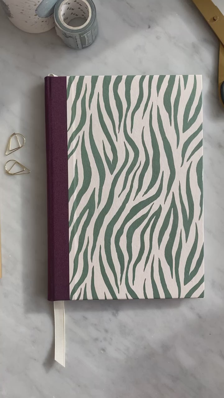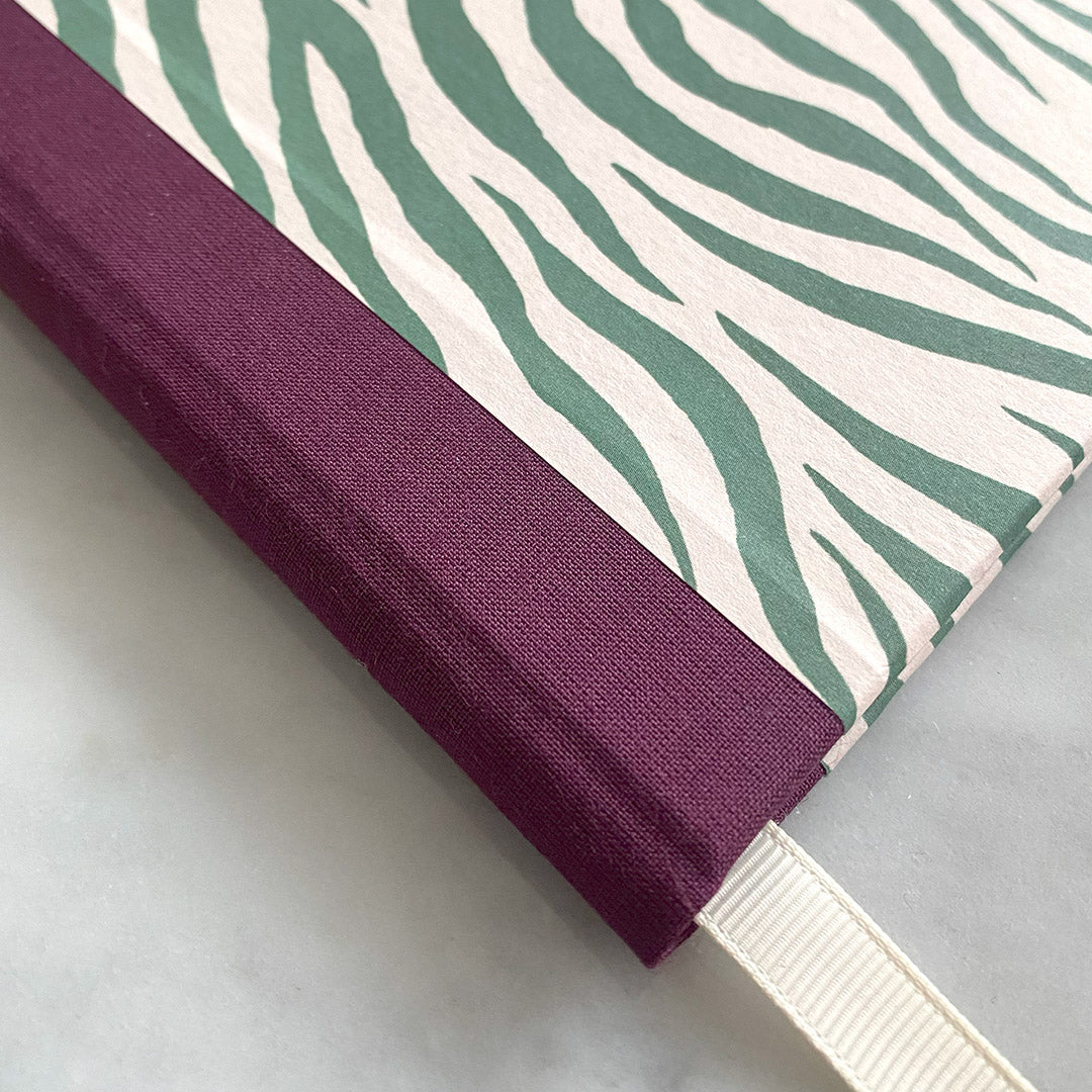 Hardback A5 notebook covered using a modern Zebra print in a muted green. Includes a complementary wine coloured cloth spine and a cream luxe Grosgrain ribbon page marker.