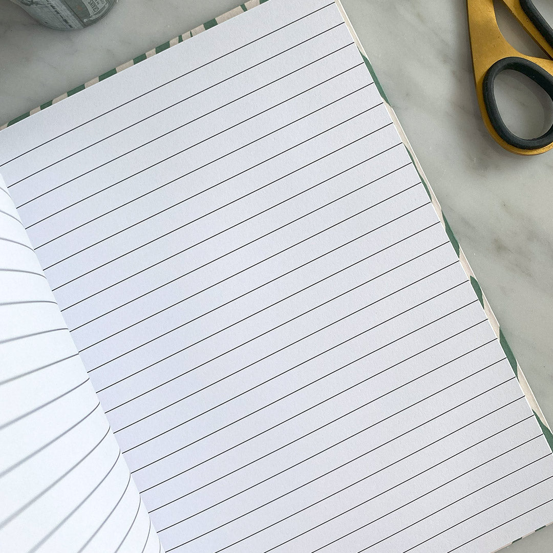 This handmade notebook includes 48 lined, recycled pages of 120gsm paper; perfect for to-do lists, note-taking or journaling. This notebook is lay flat and has been bound using waxed linen thread. It is also fineliner and fountain pen friendly.