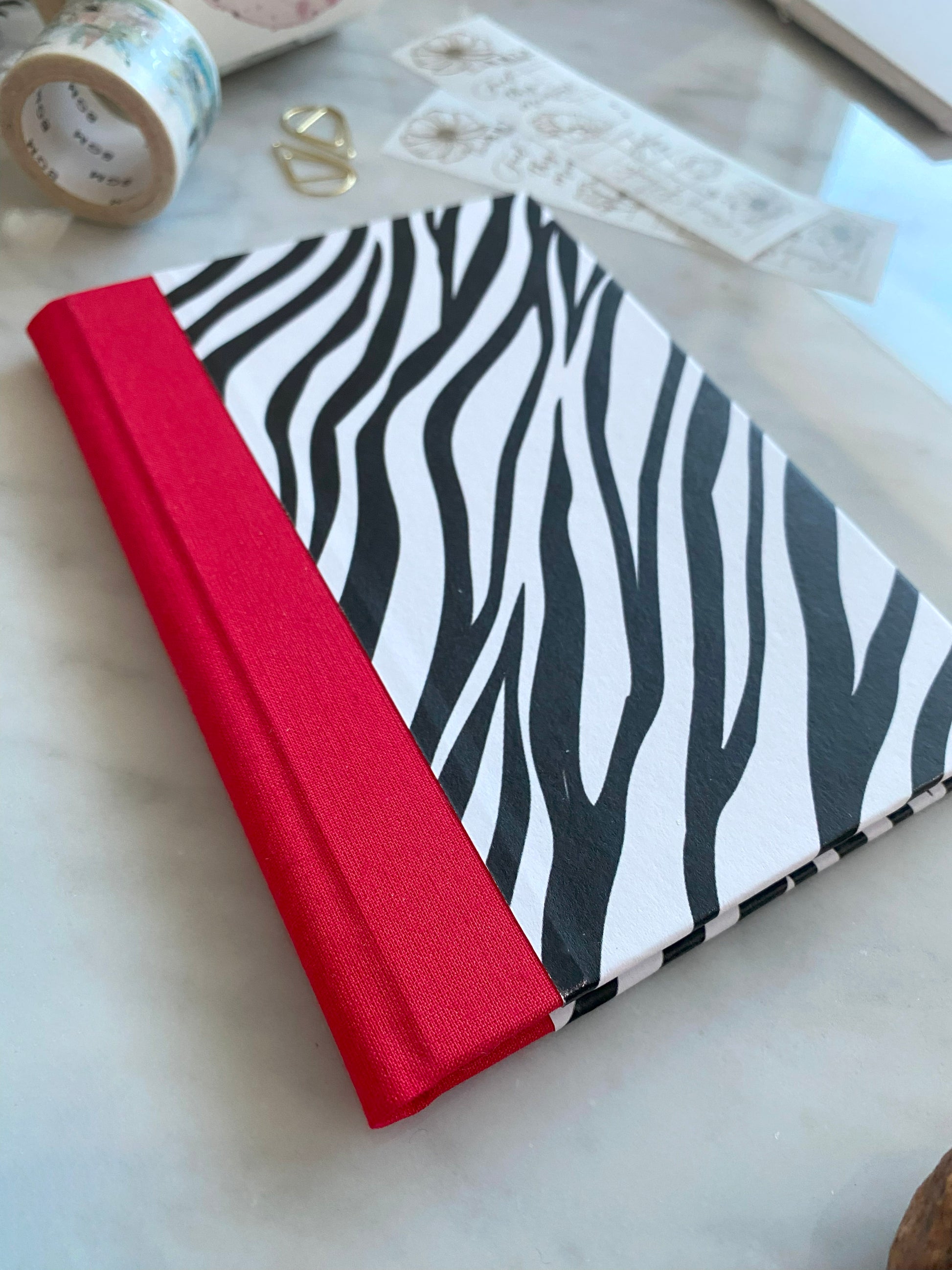 Hardback A6 pocket notebook covered in a striking Zebra print pattern with a contrasting red cloth spine.