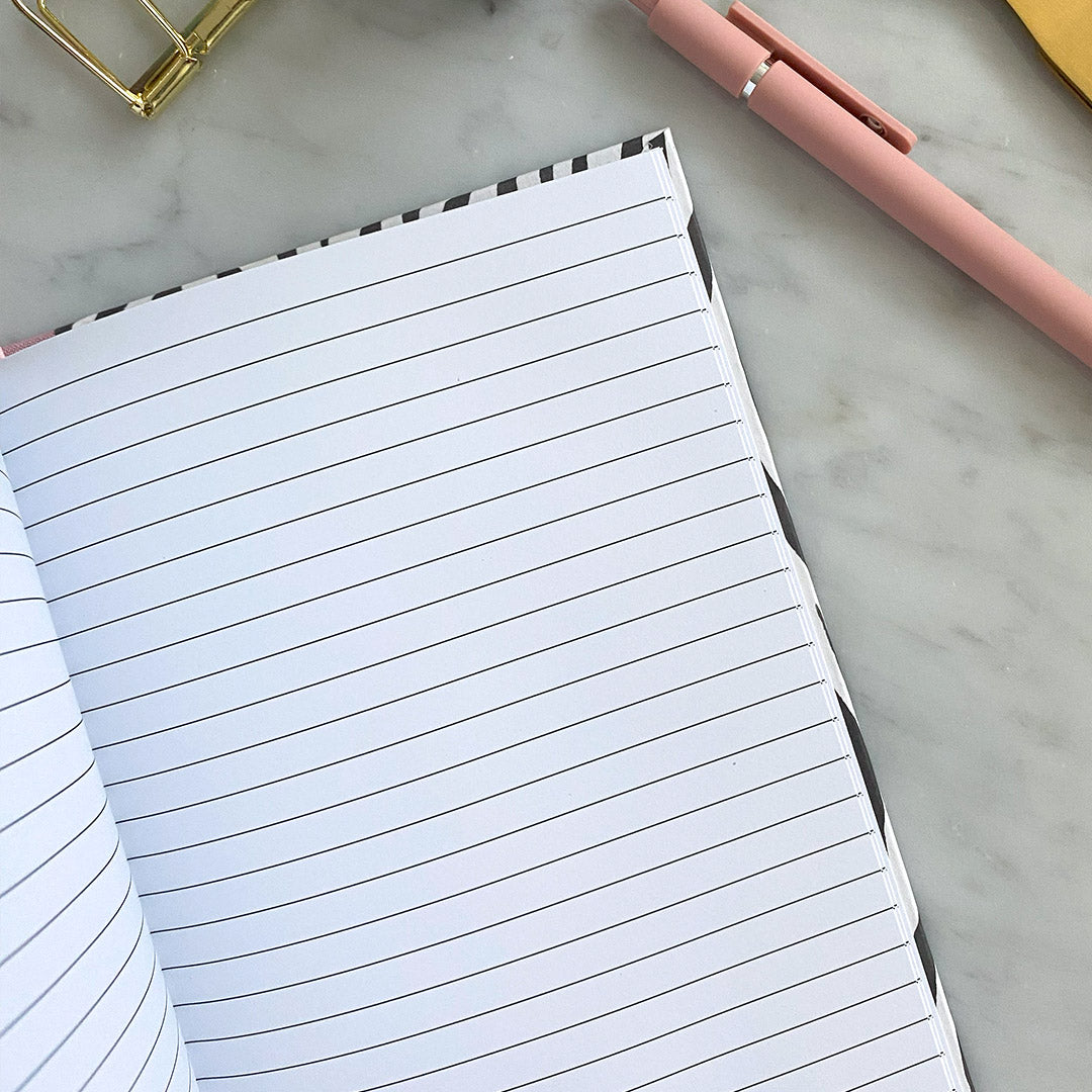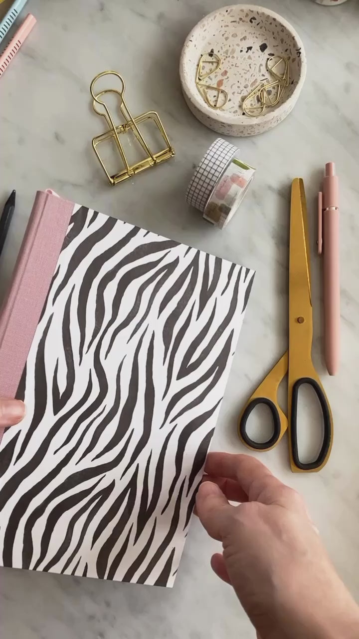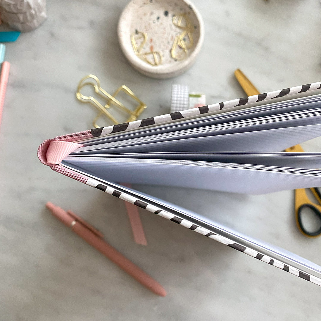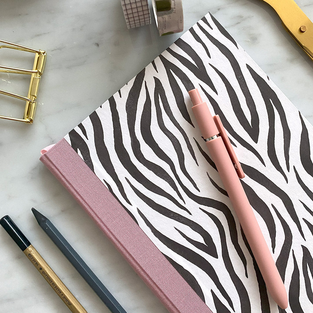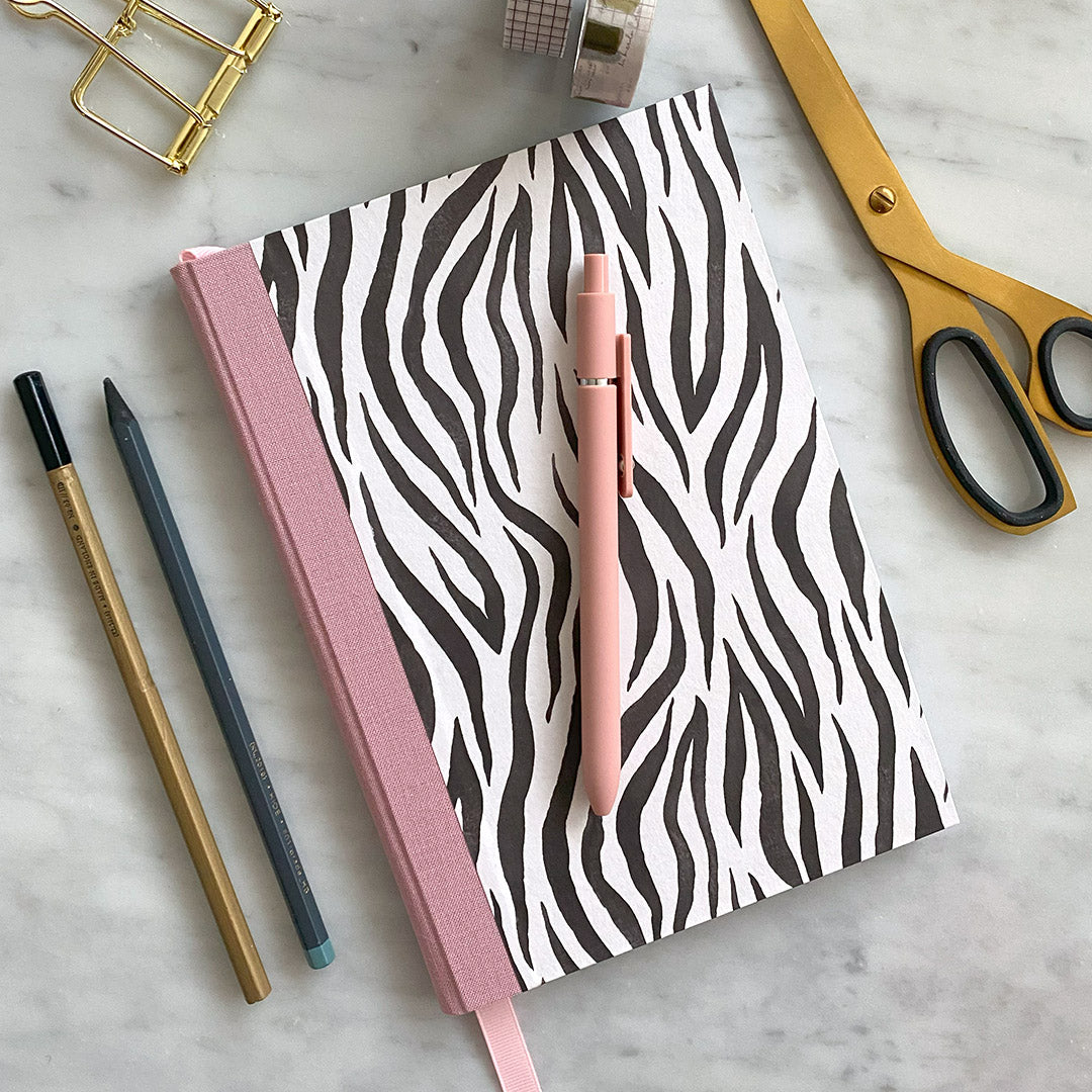 Hardback A5 notebook covered using a modern Zebra print. Includes a striking pink cloth spine and a matching luxe Grosgrain ribbon page marker.